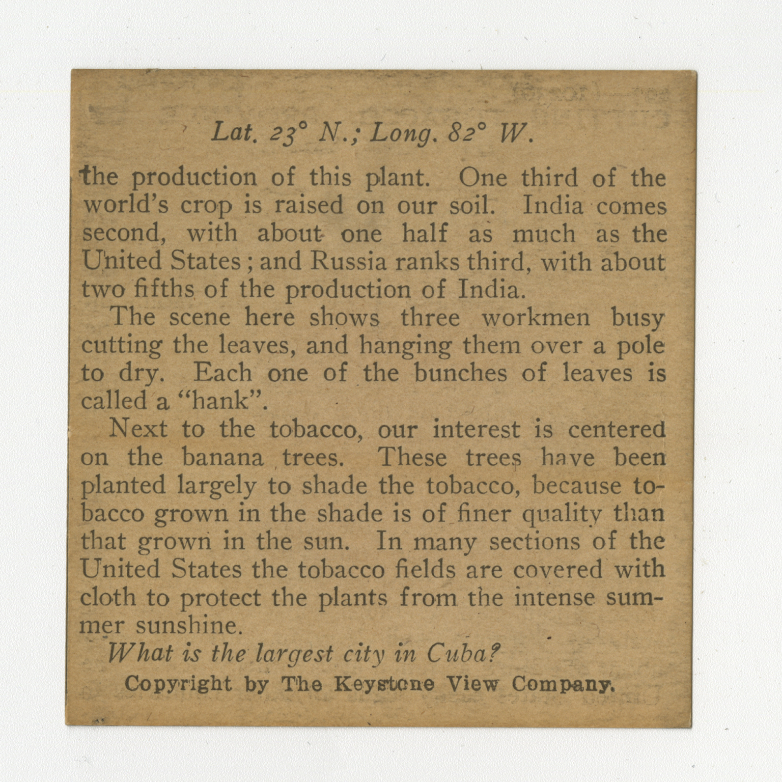 the production of this plant. One third of the world's crop is raised on our soil. India comes second, with about one half as much as the United States; and Russia ranks third, with about two fifths of the production of India. The scene here shows three workmen busy cutting the leaves, and hanging them over a pole to dry. Each one of the bunches of leaves is called a "hank". Next to the tobacco, our interest is centered on the banana trees. These trees have been planted largely to shade the tobacco, because tobacco grown in the shade is of finer quality than that grown in the sun. In many sections of the United States the tobacco fields are covered with cloth to protect the plants from the intense summer sunshine. What is the largest city in Cuba?