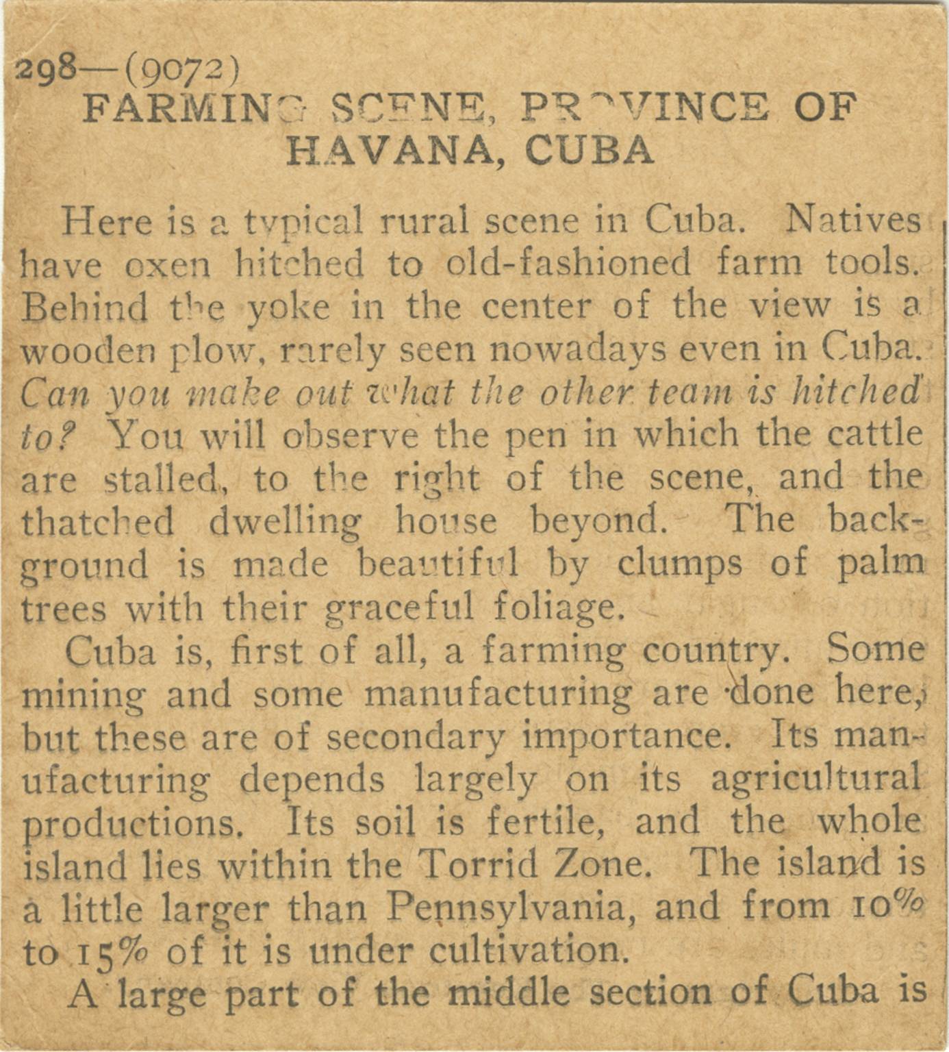 Here is a typical rural scene in Cuba. Natives here oxen hitched to old-fashioned farm tools. Behind the yoke in the center of the view is a wooden plow, rarely seen nowadaus even in Cuba. Can you make out what the other team is hitched to? You will observe the pen in which the cattle are stalled, to the right of the scene, and the thatched dwelling house beyond. The background is made beautiful by clumps of palm trees with their graceful foliage. Cuba is, first of all, a farming country. Some mining and some manufacturing are done here but these are of secondary importance. Its manufacturing depends largely on its agricultural productions. Its soil is fertile, and the whole island lies withing the Torrid Zone. The island is a little larger than Pennsylvania, and from 10% to 15% of it is under cultivation. A large part of the middle section of Cuba is