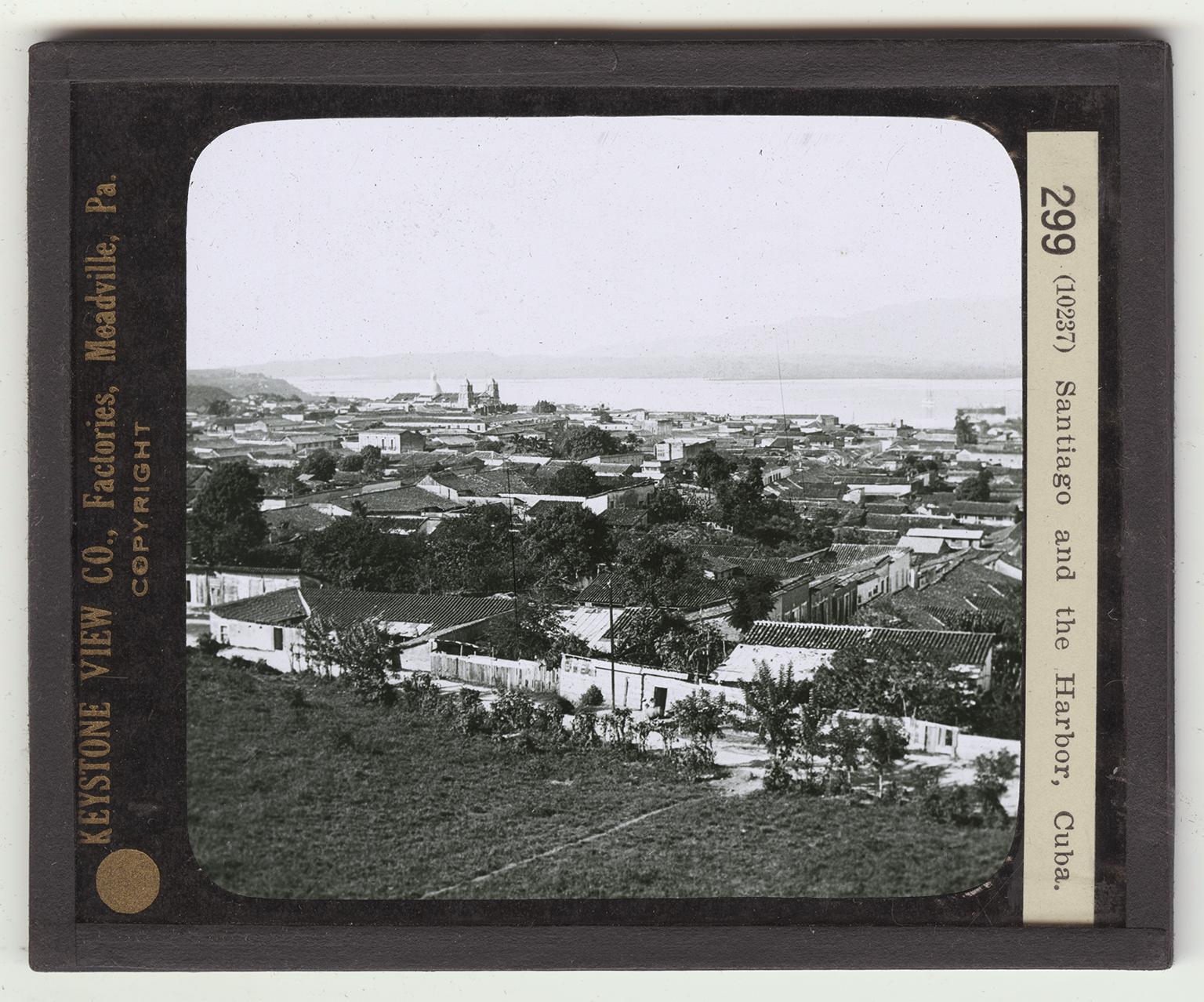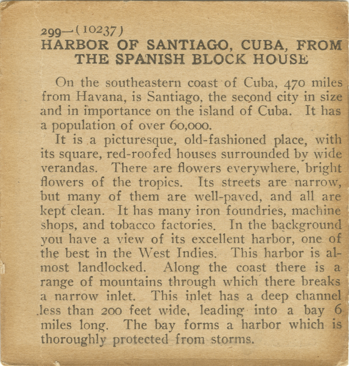 On the southeastern coast of Cuba, 470 miles from Havana, is Santiago, the second city in size and in importance on the island of Cuba. It has a population of over 60,000. It is a picturesque, old-fashioned place, with its square, red-roofed houses surrounded by wide verandes. There are flowers everywhere, bright flowers of the tropics. Its streets are narrow, but many of them are well-paved, and all are shops, and tobacco factories. In the background you have a view of its excellent harbor, one of the best in the West Indies. This harbor is almost landlocked. ALong the coast there is a range of mountains through which there breaks a narrow inlet. This inlet has a deep channel less than 200 feet wide, leading into a bay 6 miles long. The bay forms a harbor which is thoroughly protected from storms.