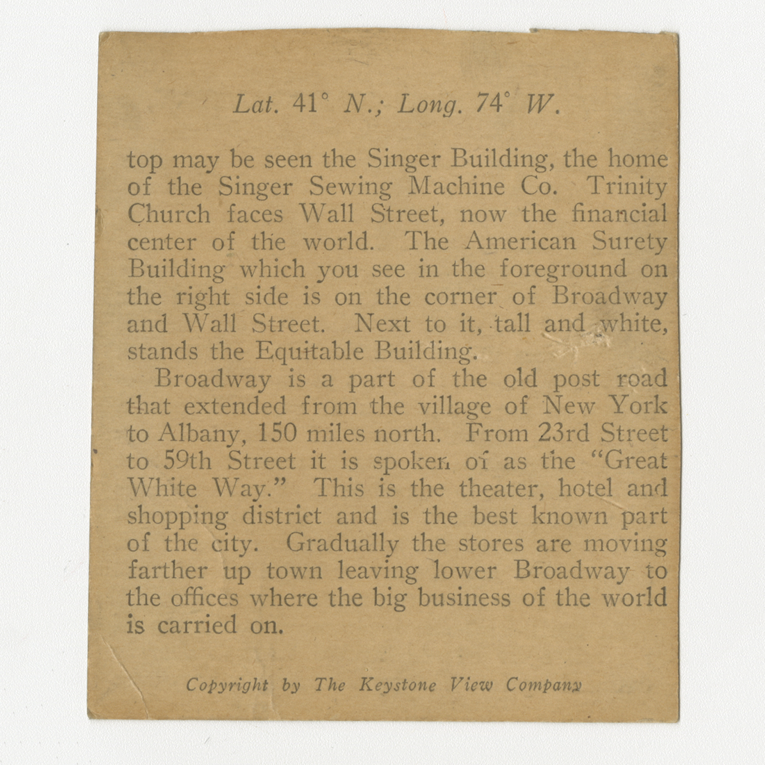 top may be seen the Singer Building, the home of the singer Sewing Machine Co. Trinity Church faces Wall Street, now the financial center of the world. The American Surety Building which you see in the foreground on the right side is on the corner of Broadway and Wall Street. Next to it, tall and white, stands the Equitable Building. Broadway is a part of the old post road that extended from the village of New York to Albany, 150 miles north. From 23rd Street to 59th Street it is spoken of as the "Great White Way." This is the theater, hotel and shopping district and is the best known part of the city. Gradually the stores are moving farther up town leaving lower Broadway to the offices where the big business of the world is carried on.