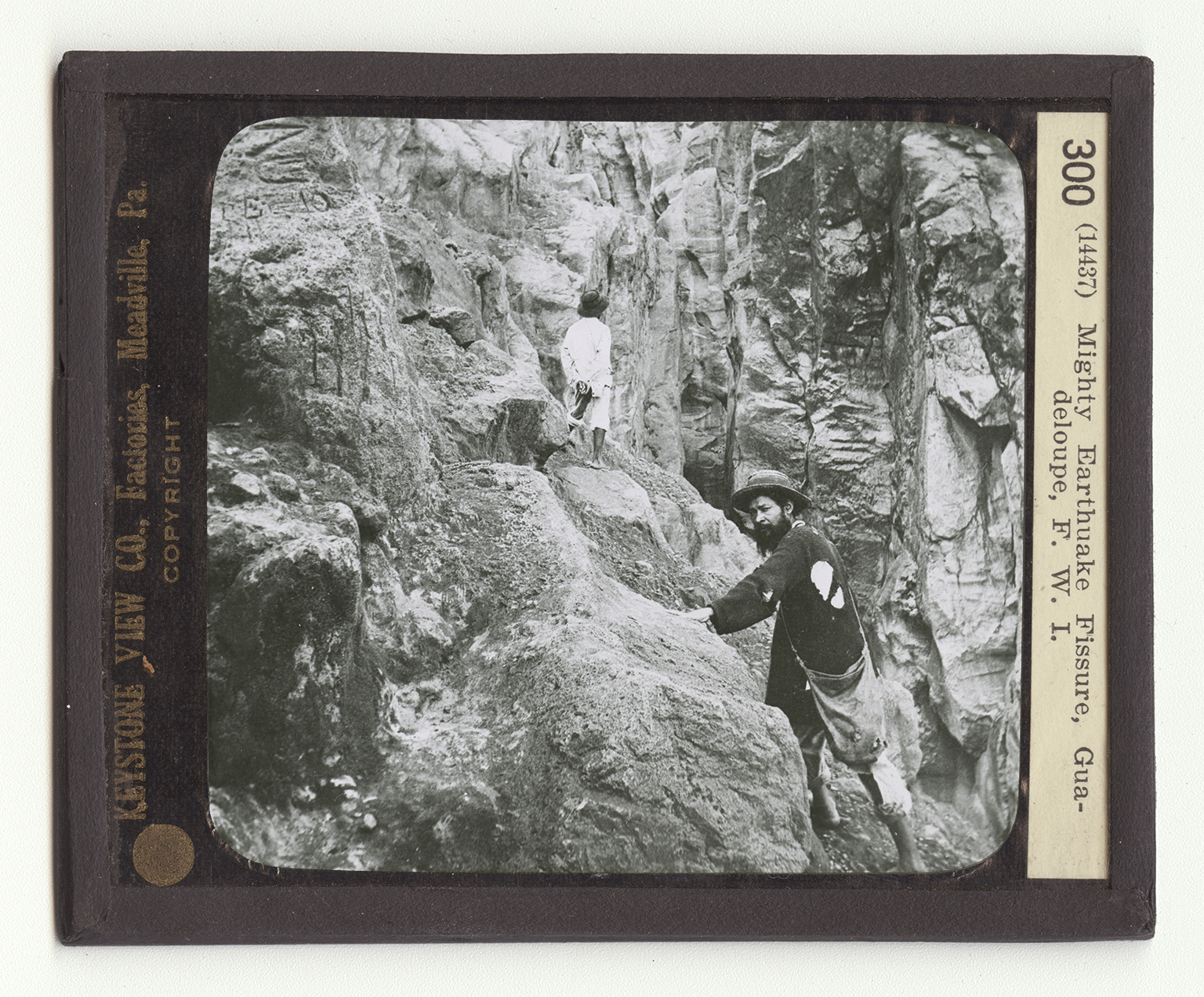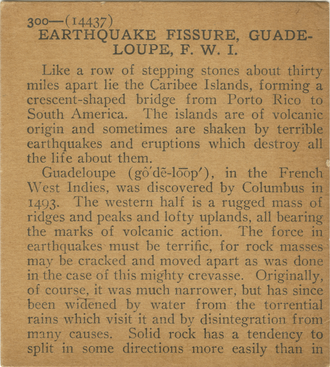 Like a row of stepping stones about thirty miles apart lie the Caribee Islands, forming a crescent shaped bridge from Porto Rico to South America. The islands are of volcanic origin and sometimes are shaken by terrible earthquakes and eruptions which destroy all the life about them. Guadeloupe, in the French West Indies, was discovered by Columbus in 1493. The western half is a rugged mass of ridges and peaks and lofty uplands, all bearing the marks of volcanic action. The force in earthquakes must be terrific, for rock masses may be cracked and moved apart as was done in the case of this mighty crevasse. Originally, of course, it was much narrower, but has since been widened by water from the torrential rains which visit it and by designation from many causes. Solid rock has a tendency to split in some directions more easily than in