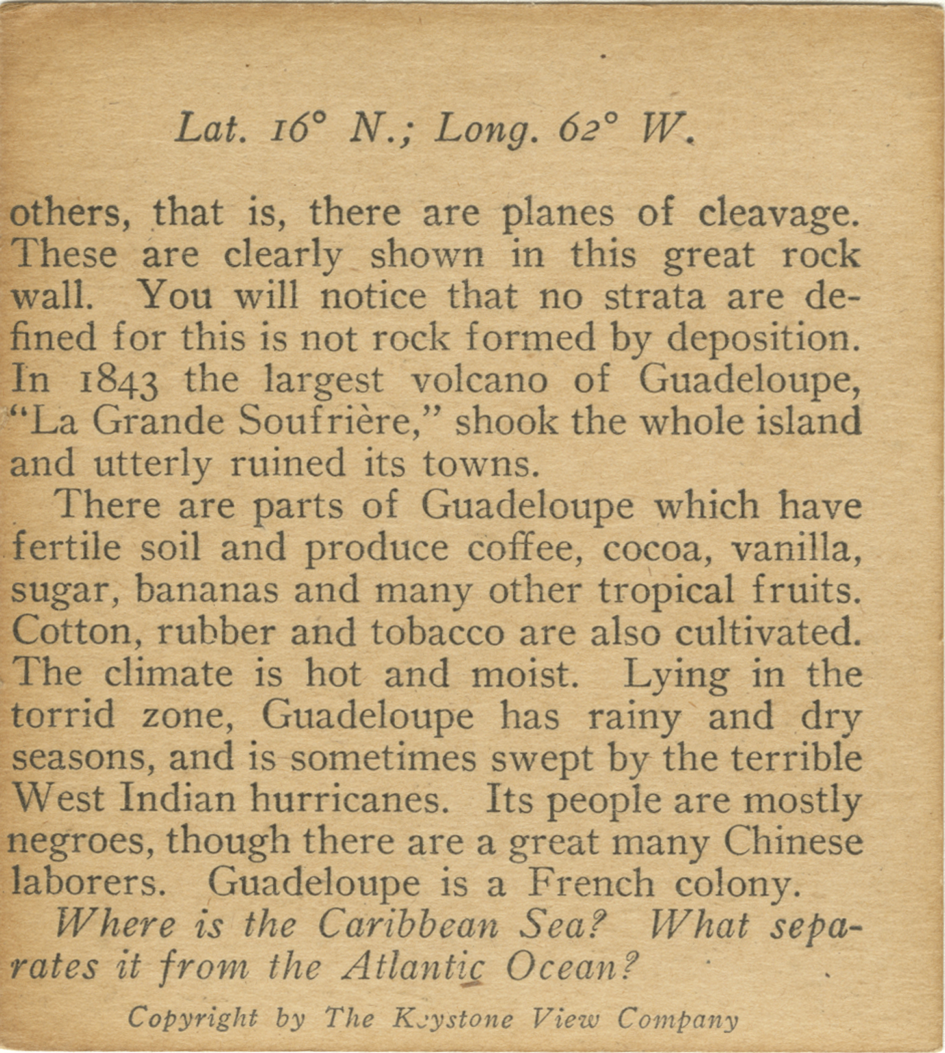 others, that is, there are planes of cleavage. These are clearly shown in this great rock wall. You will notice that no strata are defined for this is not rock formed by deposition. In 1843 the largest volcano of Guadeloupe, "La Grande Soufriere," shook the whole island and utterly ruined its towns. There are parts of Guadeloupe which have fertile soil and produce coffee, cocoa, vanilla, sugar, bananas and many other tropical fruits. Cotton, rubber and tobacco are also cultivated. The climate is hot and moist. Lying in the torrid zone, Guadeloupe has rainy and dry seasons, and is sometimes swept by the terrible seasons, and is sometimes swept by the terrible West Indian hurricanes. Its people are mostly negroes, though there are a great many Chinese laborers. Guadeloupe is a French colony. Where is the Caribbean Sea? What separates it from the Atlantic Ocean?
