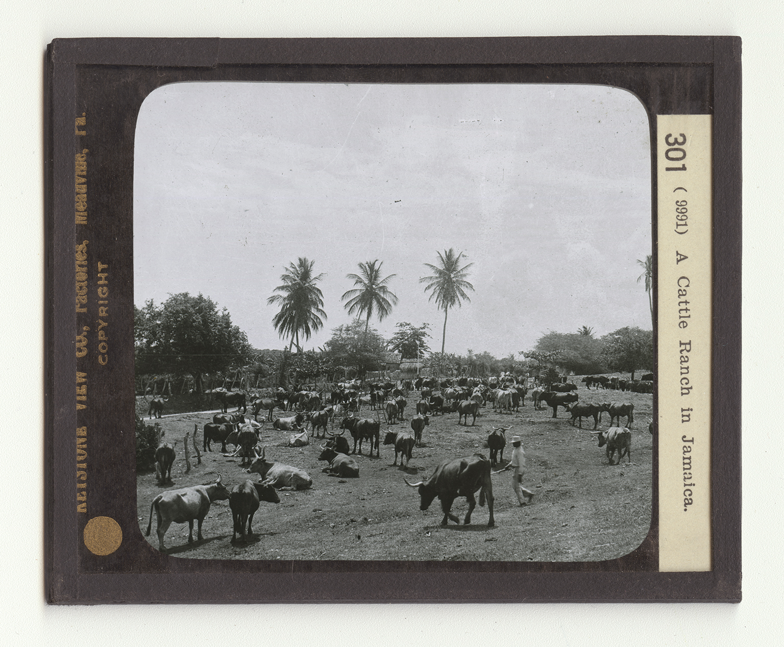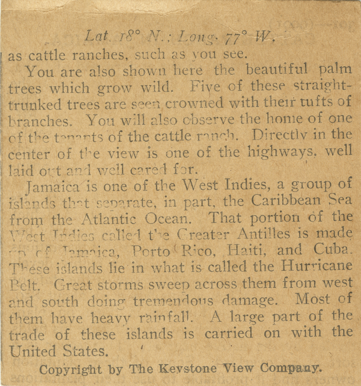 as cattle ranches, such as you see. You are also shown here the beautiful palm trees which grow wild. Five of these straight-trunked trees are seen crowded with their tufts of branches. You will also observe the home of one of the tenants of the cattle ranch. Directly in the center of the view is one of the highways well laid out and well cared for. Jamaica is one of the West Indies, a group of islands that separate, in part, the Caribbean Sea from the Atlantic Ocean. That portion of the West Indies called the Creater Antilles is made up of Jamaica, Porto Rico, Haiti, and Cuba. These islands lie in what is called the Hurricane Belt. Great storms sweep across them from west and south doing tremendous damage. Most of them have heavy rainfall. A large part of the trade of these islands is carried on with the United States.