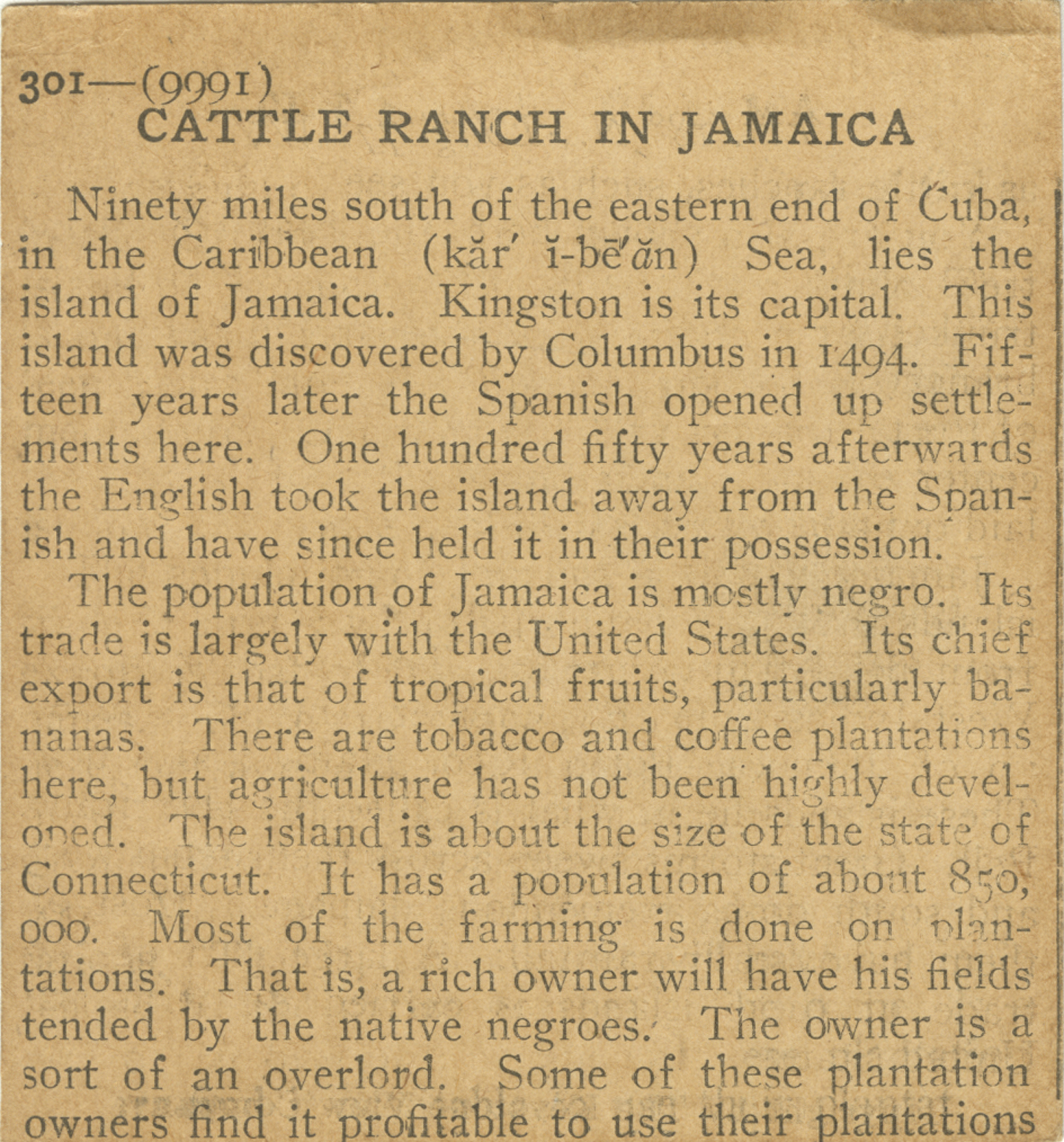 Ninety miles south of the eastern end of Cuba, in the Caribbean Sea, lies the island of Jamaica. Kingston is its capital. This island was discovered by Columbus in 1494. Fifteen years later the Spanish opened up settlements here. One hundred fifty years afterwards the English took the island away from the Spanish and have since held it in their possession. The population of Jamaica is mostly negro. Its trade is largely with the United States. Its chief export is that of tropical fruits, particularly bananas. There are tobacco and coffee plantations here, but agriculture has not been highly developed. The island is about the size of the state of Connecticut. It has a population of about 850,000. Most of the farming is done on plantations. That is, a rich owner will have his fields tended by the native negroes. The owner is a sort of an overlord. Some of these plantation owners find it profitable to use their plantations