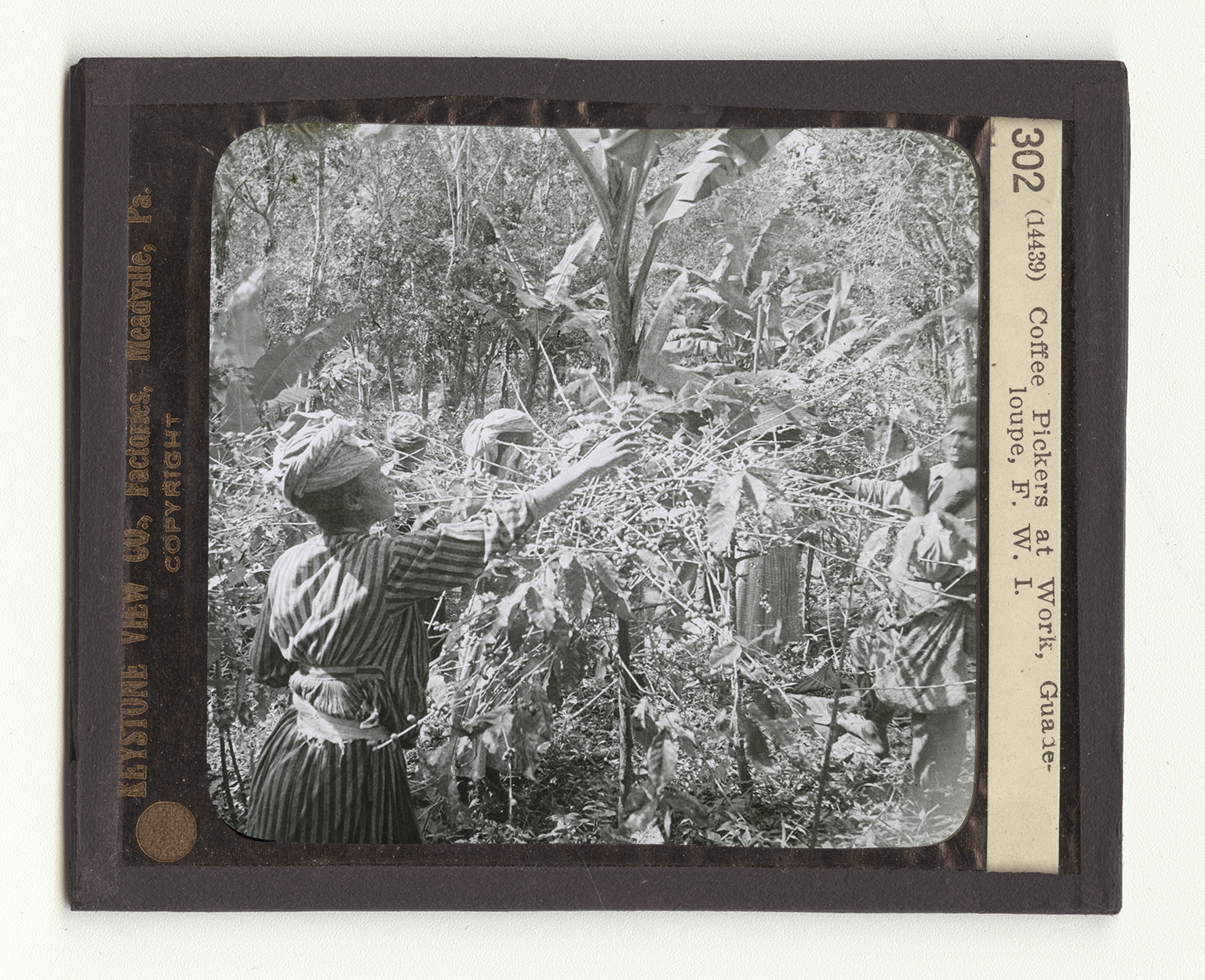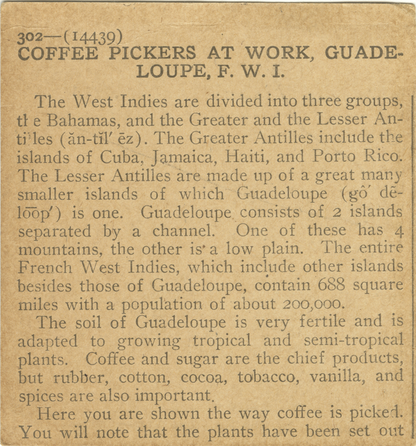 The West Indies are divided into three groups, the Bahamas, and the Greater and the Lesser Antilles. The Greater Antilles include the islands of Cuba, Jamaica, Haiti, and Porto Rico. The Lesser Antilles are made up of a great many smaller islands of which Guadeloupe consists of 2 islands separated by a channel. One of these has 4 mountains, and other is a low plain. The entire French West Indies, which include other islands besides those of Guadeloupe, contain 688 square miles with a population of about 200,000. The soil of Guadeloupe is very fertile and is adapted to growing tropical and semi-tropical plants. Coffee and sugar are the chief products but rubber, cotton, cocoa, tobacco, vanilla, and spices are also important. Here you are shown the way coffee is picked. You will note that the plants have been set out