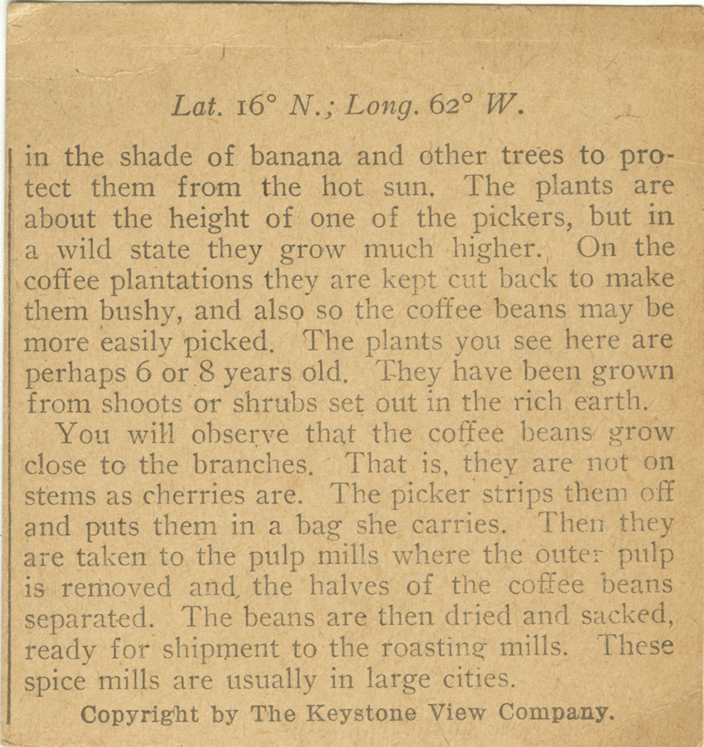 in the shade of banana and other trees to protect them from the hot sun. The plants are about the height of one of the pickers, but in a wild state they grow much higher. On the coffee plantations they are kept cut back to make them bushy, and also so the coffee beans may be more easily picked. The plants you see here are perhaps 6 or 8 years old. They have been grown from shoots or shrubs set out in the rich earth. You will observe that the coffee beans grow close to the branches. That is, they are not on stems as cherries are. The picker strips them off and puts them in a bag she carries. Then they are taken to the pulp mills where the outer pulp is removed and the halves of the coffee beans separated. The beans are then dried and sacked, ready for shipment to the roasting mills. These spice mills are usually in large cities.