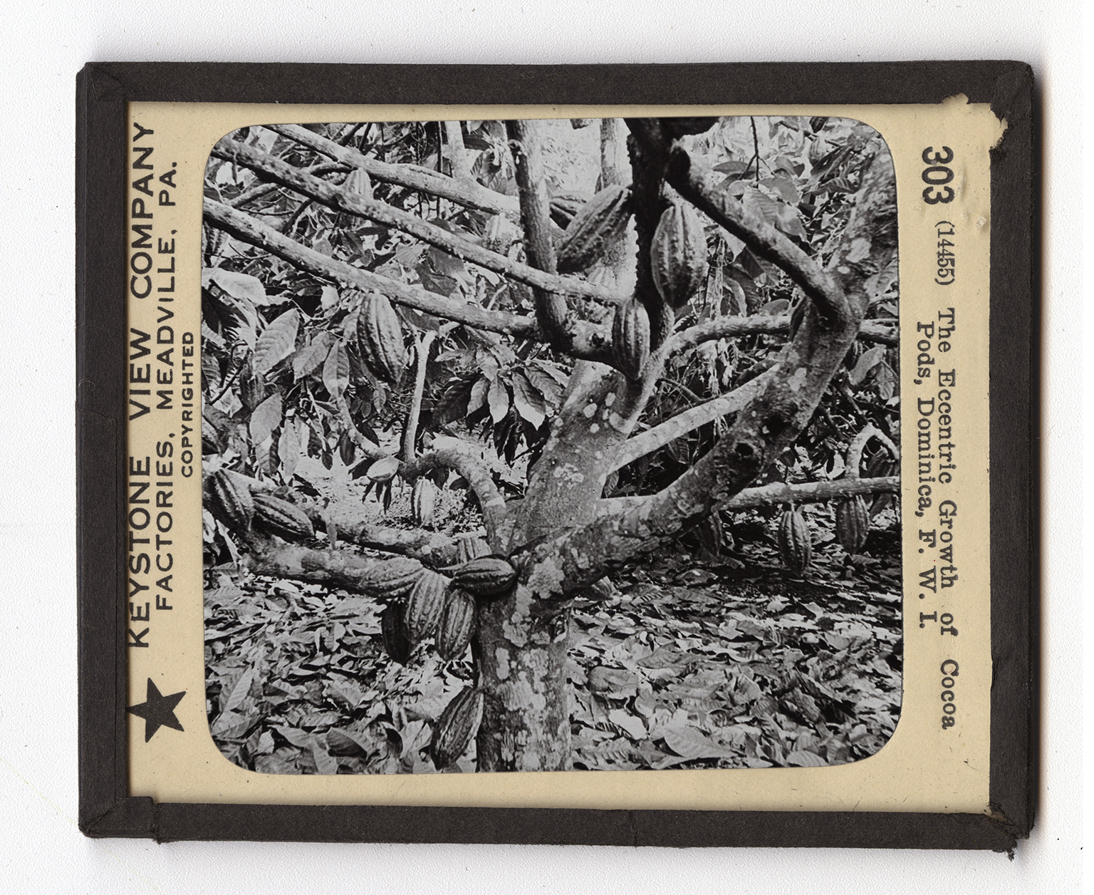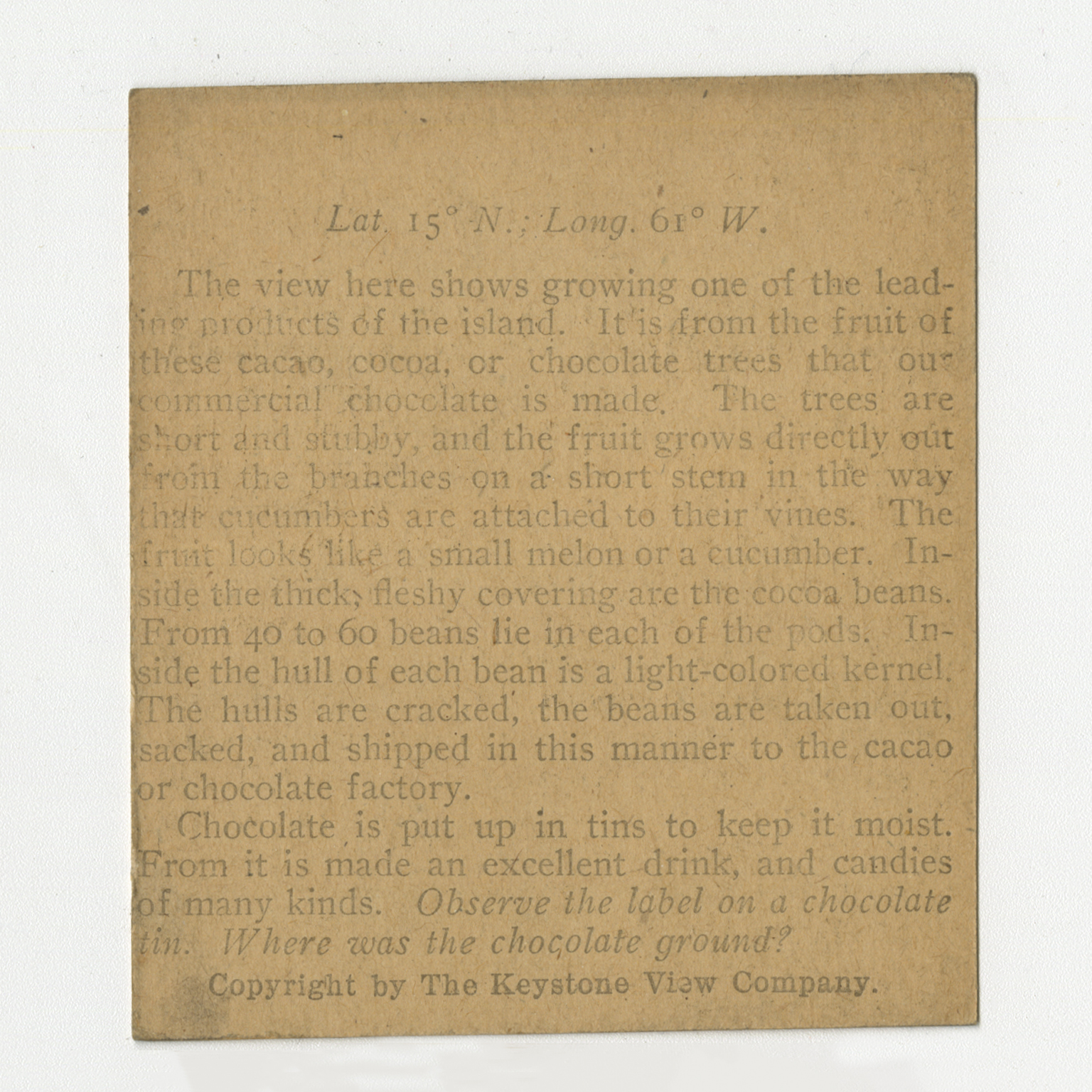 The view here shows growing one of the leading products of the island. It is from the fruit of these cacao, or chocolate trees that our commercial chocolate is made. The trees are short and stubby, and the fruit grows directly out from the branches on a short stem in the way that cucumbers are attached to their vines. The fruit looks like a small melon or a cucumber. Inside the thick fleshy covering are the cocoa beans. From 40 to 60 beans lie in each of the pods. Inside the hull of each bean is light-colored kernel. The hulls are cracked, the beans are taken out, sacked, and shipped in this manner to the cacao or chocolate factory. Chocolate is put up in tins to keep it moist. From it is made an excellent drink, and candies of many kinds. Observe the label on a chocolate tin. Where was the chocolate ground?