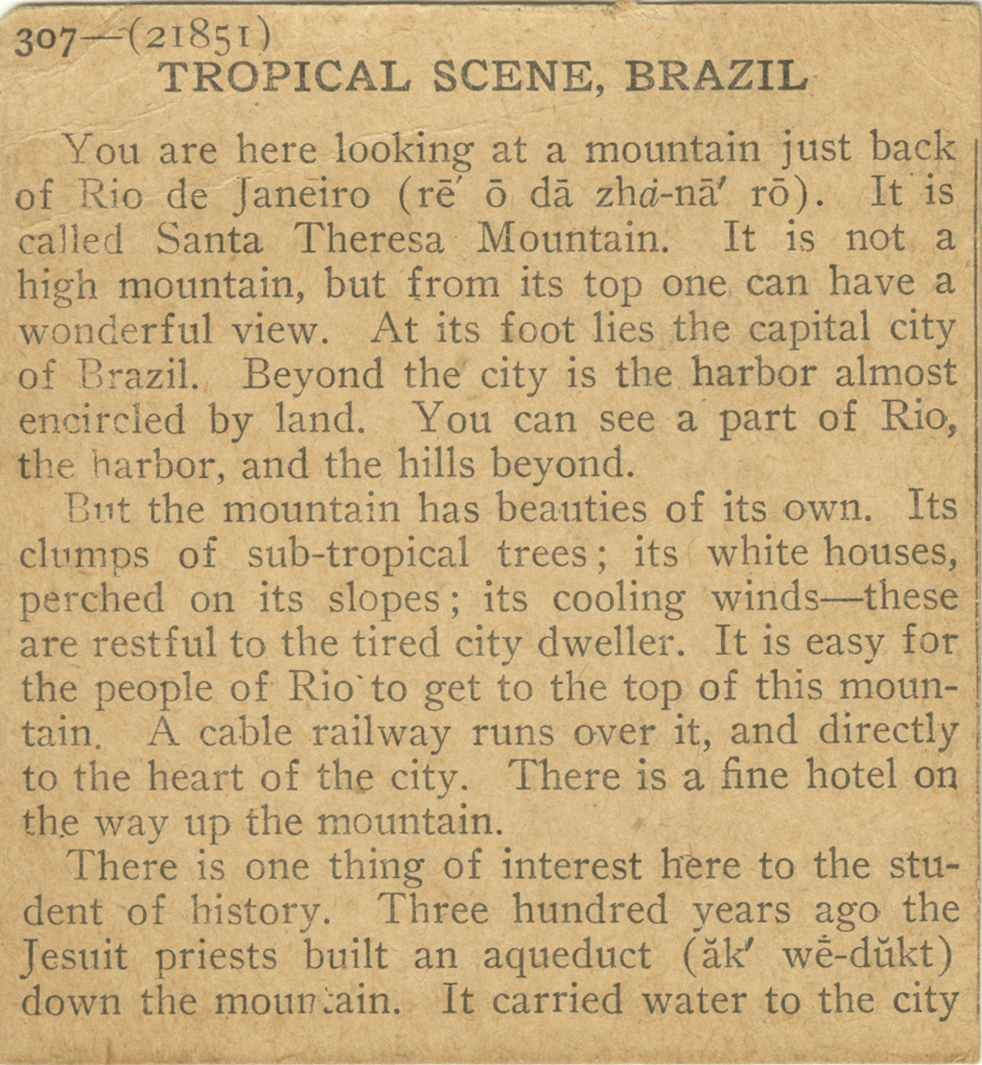 You are here looking at a mountain just back of Rio de Janeiro. It is called Santa Theresa Mountain. It is not a high mountain, but from its top one can have a wonderful view. At its foot lies the capital city of Brazil. Beyond the city is the harbor almost encircled by land. You can see a part of Rio, the harbor, and the hills beyond. But the mountain has beauties of its own. Its clumps of sub-tropical trees; its white houses, perched on its slopes; its coolings winds - these are restful to the tired city dweller. It is easy for the people of Rio to get to the top of this mountain. A cable railway runs over it, and directly to the heart of the city. There is a fine hotel on the way up the mountain. There is one thing of interest here to the student of history. Three hundred years ago the Jesuit priests built an aqueduct down the mountain. It carried water to the city
