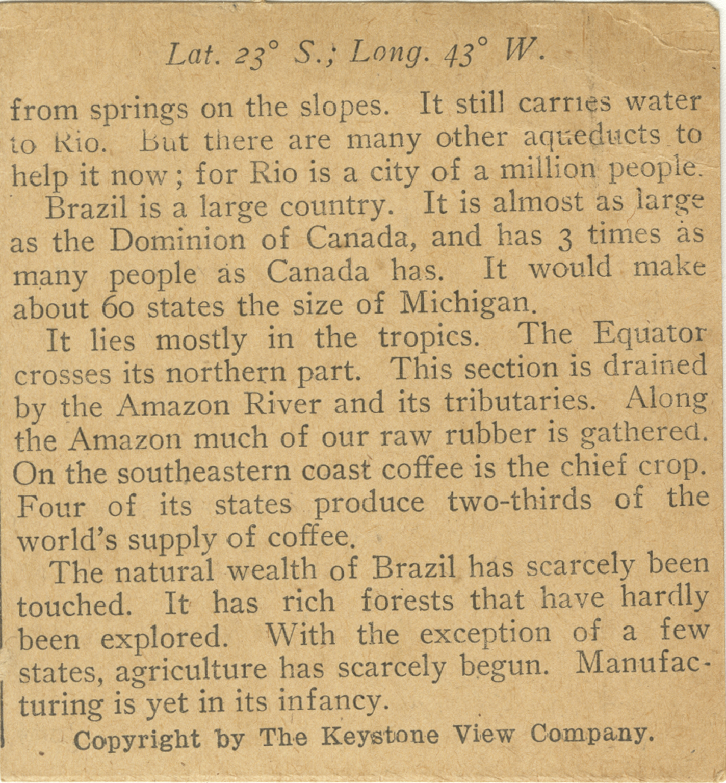 from springs on the slopes. It still carries water to Rio. But there are many other aqueducts to help it now; for Rio is a city of a million people. Brazil is a large country. It is almost as large as the Dominion of Canada, and has 3 times as many people as Canada has. It would make about 60 states the size of Michigan. It lies mostly in the tropics. The Equator crosses its northern part. This section is drained by the Amazon River and its tributaries. Along the Amazon River and its tributaries. Along the Amazon much of our raw rubber is gathered. On the southeastern coast coffee is the chief crop. Four of its states produce two-thirds of the world's supply of coffee. The natural wealth of Brazil has scarcely been touched. It has rich forests that have hardly been explored. With the exception of a few states, agriculture has scarcely begun. Manufacturing is yet in its infancy.