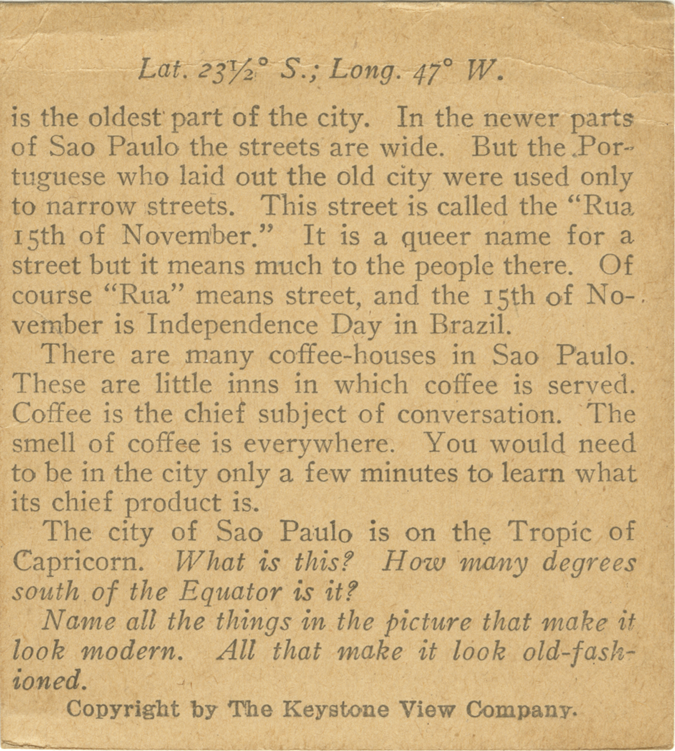 is the oldest part of the city. In the newer parts of Sao Paulo the streets are wide. But the Portugese who laid out the old city were used only to narrow streets. This street is called the "Rua 15th of November." It is a queer name for a street but it means much to the people there. Of course "Rua" means street, and the 15th of November is Independence Day in Brazil. There are many coffee-houses in Sao Paulo. These are little inns in which coffee is served. Coffee is the chief subject of conversation. The smell of coffee is everywhere. You would need to be in the ctiy only a few minutes to learn what its chief product is. The city of Sao Paulo is on the Tropic of Capricorn. What is this? How many degrees south of the Equator is it? Name all the things in the picture that make it look modern. All that make it look old-fashioned.