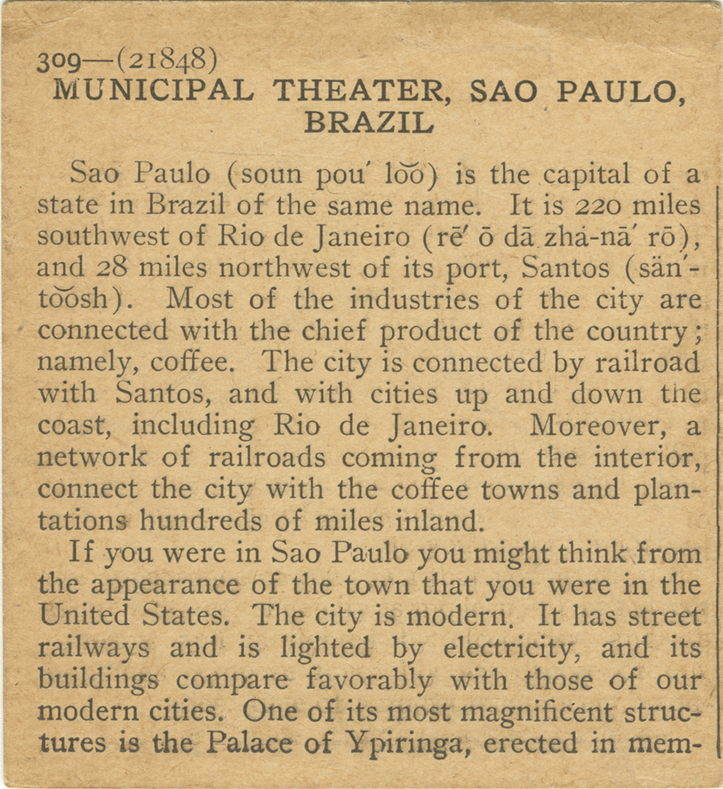 Sao Paulo is the capital of a state in Brazil of the same name. It is 220 miles southwest of Rio de Janeiro, and 28 miles northwest of its port, Santos. Most of the industries of the city are connected with the chief product of the country; namely coffee. The city is connected by railroad with Santos, and with cities up and down the coast, includng Rio de Janeiro. Moreover, a network of railroads coming from the interior, connect the city with the coffee towns and plantations hundreds of miles inland. If you were in Sao Paulo you might think from the appearance of the twon that you were in the United States. The city is modern. It has street railways and is lighted by electricity, and its buildings compare favorably with those of our modern cities. One of its most magnificent structures is the Palace of Ypiringa, erected in mem-