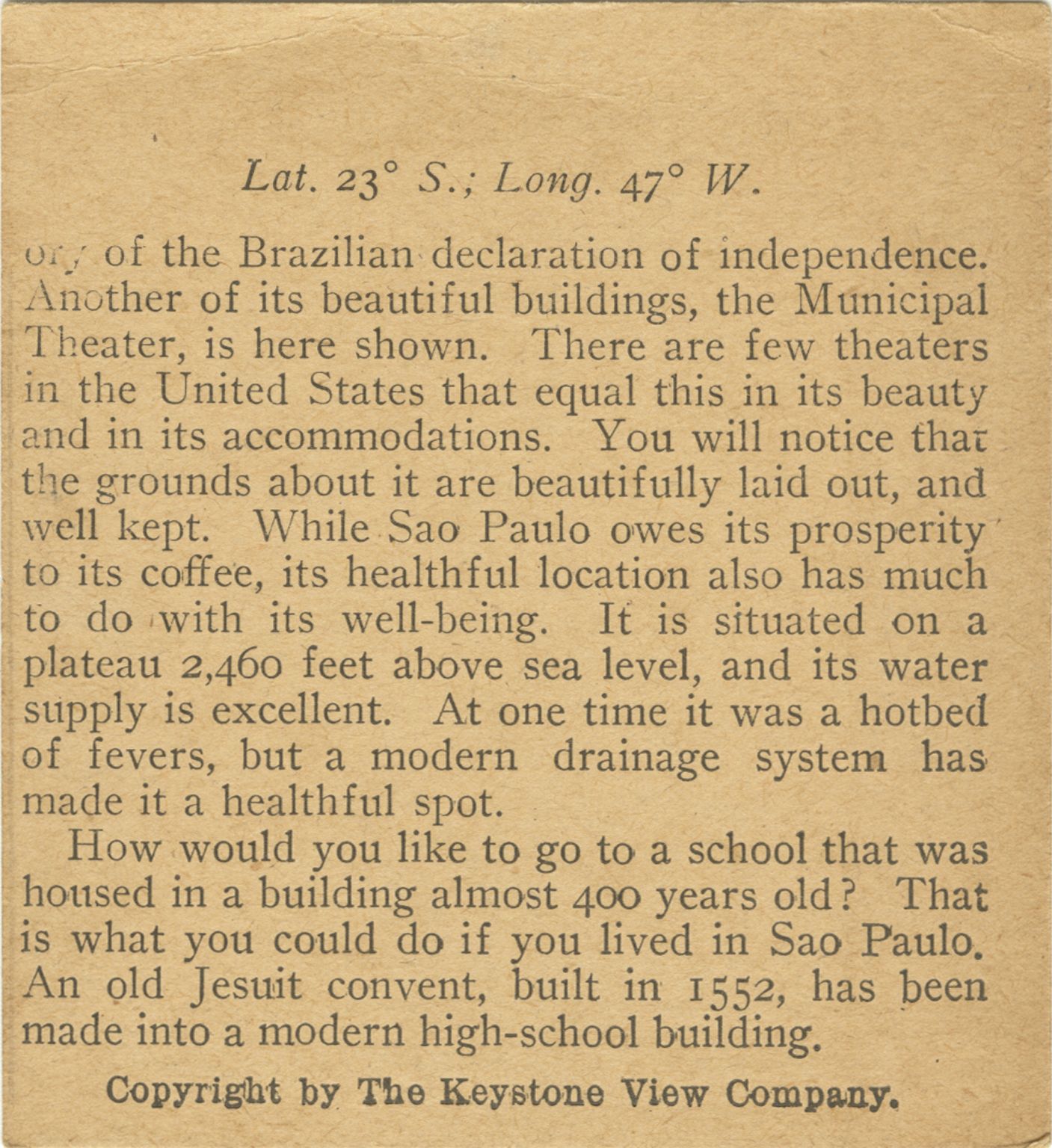 ory of the Brazilian declaration of independence. Another of its beautiful buildings, the Municipal Theater, is here shown. There are few theaters in the United States that equal this in its beauty and in its accommodations. You will notice that the grounds about it are beautifully laid out, and well kept. While Sao Paulo owes its prosperity to its coffee, its healthful location also has much to do with its well-being. It is situated on a plateau 2,460 feet above sea level, and its water supply is excellent. At one time it was a hotbed of fevers, but a modern drainage system has made it a healthful spot. How would you like to go to a school that was housed in a building almost 400 years old? That is what you could do if you lived in Sao Paulo. An old Jesuit convent, built in 1552, has been made into a modern high-school building.
