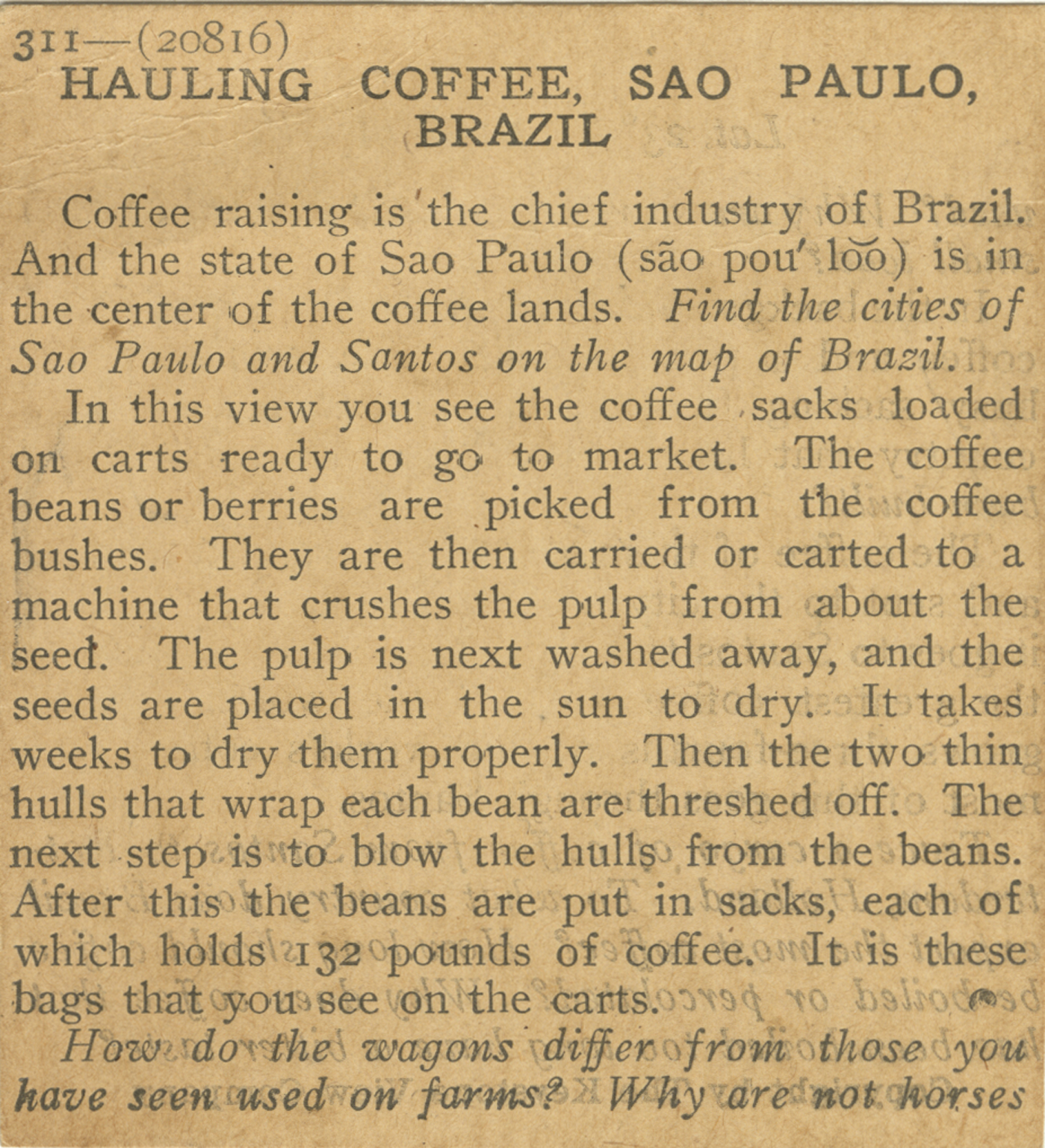 Coffee raising is the chief industry of Brazil. And the state of Sao Paulo is in the center of the coffee lands. Find the cities of Sao Paulo and Santos on the map of Brazil. In this view you see the coffee sacks loaded on carts ready to go to market. The coffee beans or berries are picked from the coffee bushes. They are then carried or carted to a machine that crushes the pulp from about the seed. The pulp is next washed away, and the seeds are placed in the sun to dry. It takes weeks to dry them properly. Then the two thin hulls that wrap each bean are threshed off. The next step is to blow the hulls from the beans. After this the beans are put in sacks, each of which holds 132 pounds of coffee. It is these bags that you see on the carts. How do the wagons differ from those you have seen used on farms? Why are not horses
