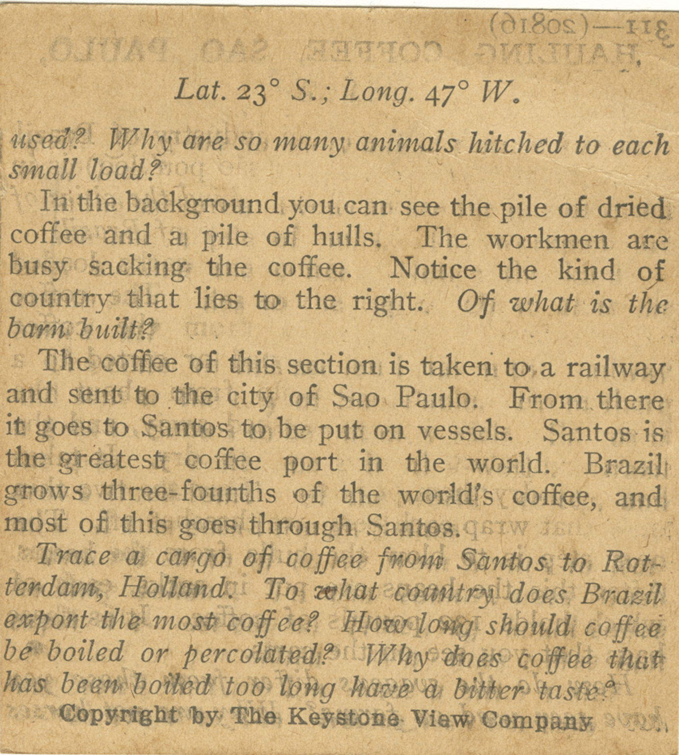 used? Why are so many animals hitched to each small load? In the background you can see the pile of dried coffee and a pile of hulls. The workmen are busy sacking the coffee. Notice the kind of country that lies to the right. Of what is the barn built? The coffee of this section is taken to a railway and sent to the city of Sao Paulo. From there it goes to Santos to be put on vessels. Santas is the greatest coffee port in the world. Brazil grows three-fourths of the world's coffee, and most of this goes through Santos. Trace a cargo of coffee from Santos to Rotterdam, Holland. To what country does Brazil export the most coffee? How long should coffee be boiled or percolated? Why does coffee that has been boiled too long have a bitter taste?