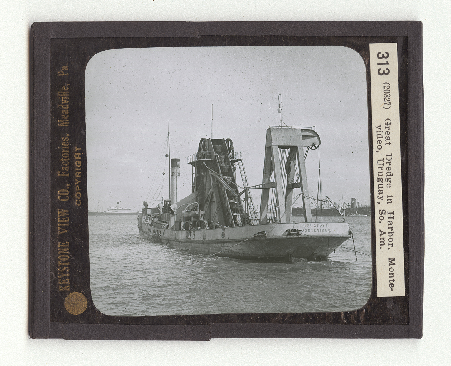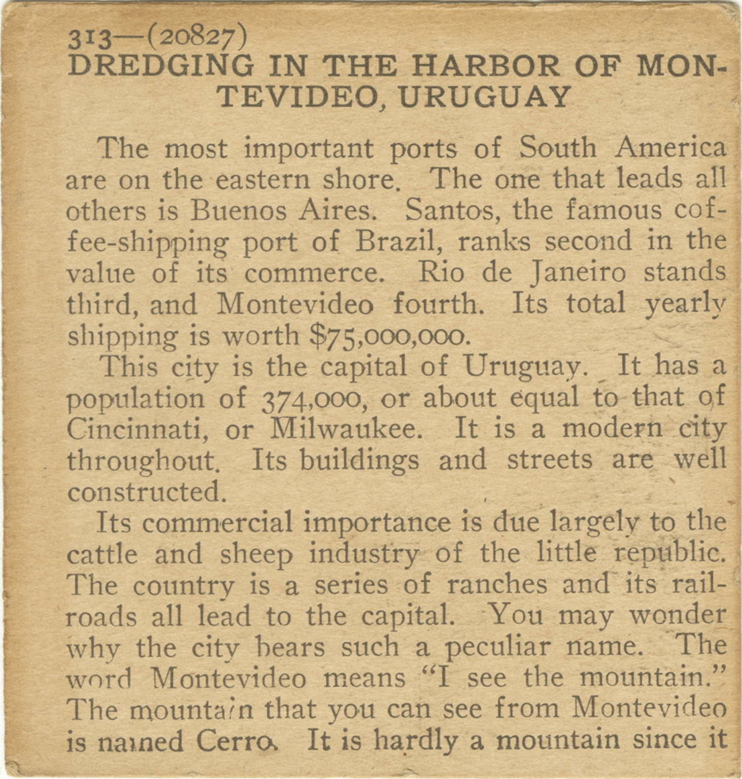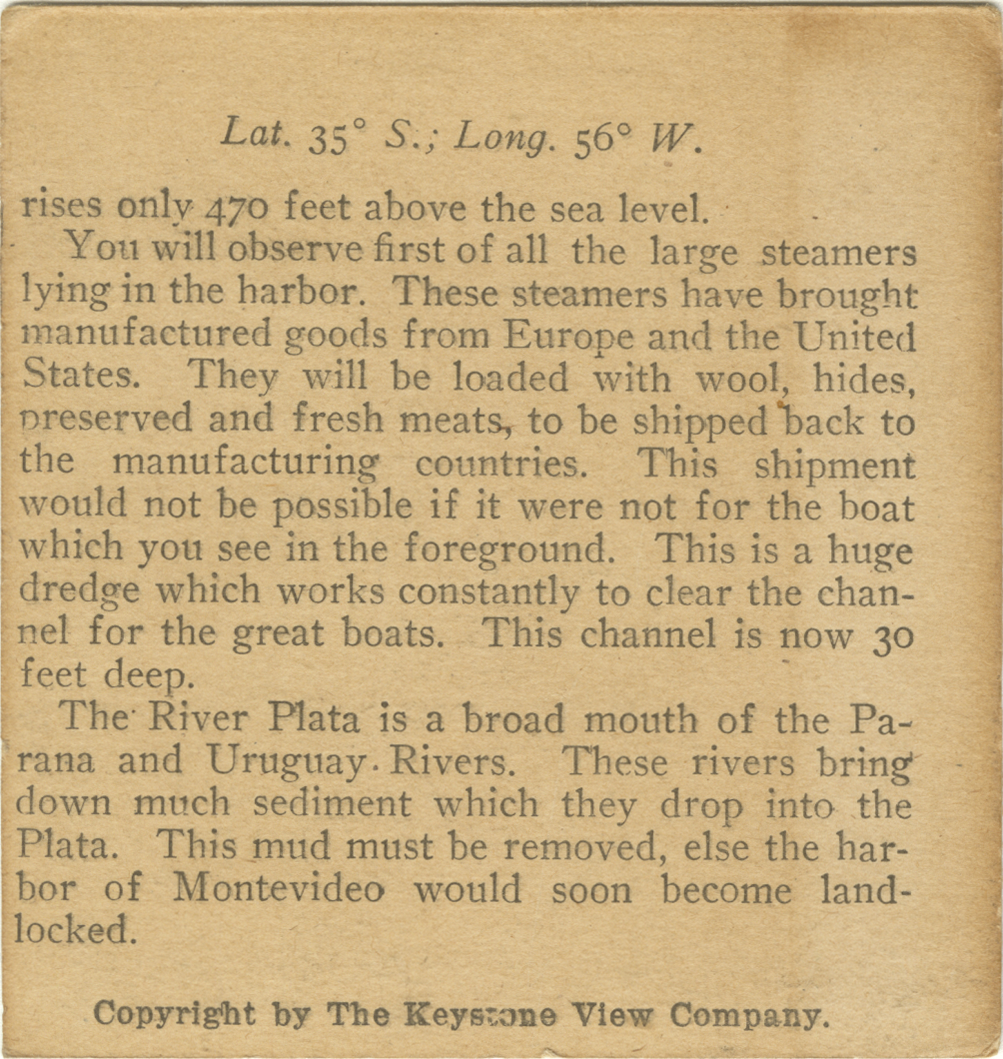 rises only 470 feet above the sea level. You will observe first of all the large steamers lying in the harbor. These steamers have brought manufactured goods from Europe and the United States. They will be loaded with wool, hides, preserved and fresh meats, to be shipped back to the manufacturing countries. This shipment would not be possible if it were not for the boat which you see in the foreground. This is a huge dredge which works constantly to clear the channel for the great boats. This channel is now 30 feet deep. The River Plata is a broad mouth of the Parana and Uruguay Rivers. These rivers bring down much sediment which they drop into the Plata. This mud must be removed, else the harbor of Montevideo would soon beocme landlocked.