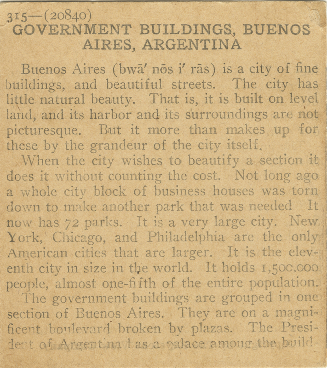 Buenos Aires is a city of fine buildings, and beautiful streets. The city has little natural beauty. That is, it is built on level land, and its harbor and its surroundings are not picturesque. But it more than makes up for these by the grandeur of the city itself. When the city wishes to beautify a section it does it without counting the cost. Not long ago a whole city blocks of business houses was torn down to make another park that was needed. It now has 72 parks. It is a very large city. New York, Chicago, and Philadelphia are the only American cities that are larger. It is the eleventh city in size in the world. It holds 1,500,000 people, almost one-fifth of the entire population. The government buildings are grouped in one section of Buenos Aires. They are on a magnificent boulevard broken by plazas. The President of Argentina has a palace among the build-