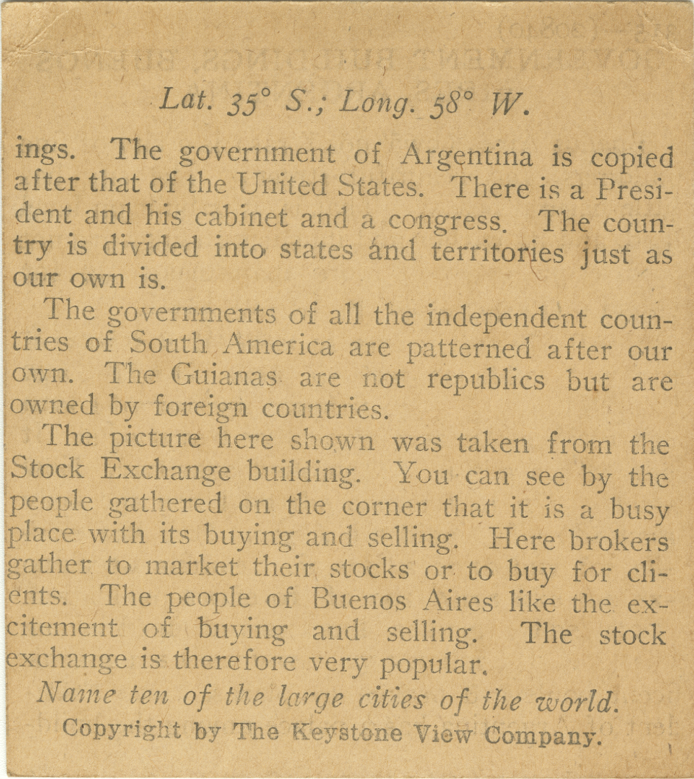 ings. The government of Argentina is coped after that of the United States. There is a President and his cabinet and congress. The country is divided into states and territories just as our own is. The governments of all the independent countries of South America are patterned after out own. The Guinas are not republics but are owned by foreign countries. The picture here shown was raken from the Stock Exchange building. You can see by the people gathered on the corner that it is a busy place with its buying and selling. Here brokers gather to market their stocks or to buy for clients. The people of Buenos Aires like the excitement of buying and selling. The stock exchange is therefore very popular. Name ten of the largest cities of the world.