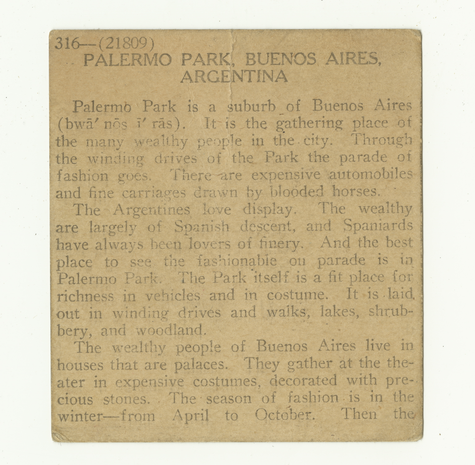 Palermo Park is a suburb of Buenos Aires. It is the gathering place of the many wealthy people in the city. Through the winding drives of the Park the parade of fashion goes. There are expensive automobiles and fine carriages drawn by blooded horses. The Argentines love display. The wealthy are largely of Spanish descent, and Spaniards have always been lovers of finery. And the best place to see the fashionable on parade is in Palermo Park. The Park itself is a fit place for richness in vehicles and in costume. It is laid out in winding drives and walks, lakes, shrubbery, and woodland. The wealthy people of Buenos Aires live in houses that are palaces. They gather at the theater in expensive costumes, decorated with precious stones. The season of fashion is in the winter - from April to October. Then the