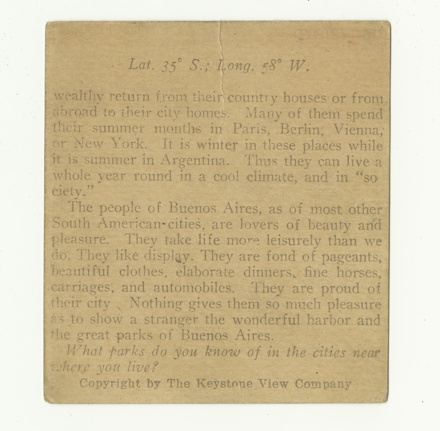 wealthy return from their country houses or from abroad to their city homes. Many of them spend their summer months in Paris, Berlin, Vienna, or New York. It is winter in these places while it is summer in Argentina. Thus they can live a whole year round in a cool climate, and in "society." The people of Buenos Aires, as of most other South American cities, are lovers of beauty and pleasure. They take life more leisurely than we do. They like display. They are fond of pageants, beautiful clothes, elaborate dinners, fine horses, carriages, and automobiles. They are proud of their city. Nothing gives them so much pleasure as to show a stranger the wonderful harbor and the great parks of Buenos Aires. What parks do you know of in the cities where you live?