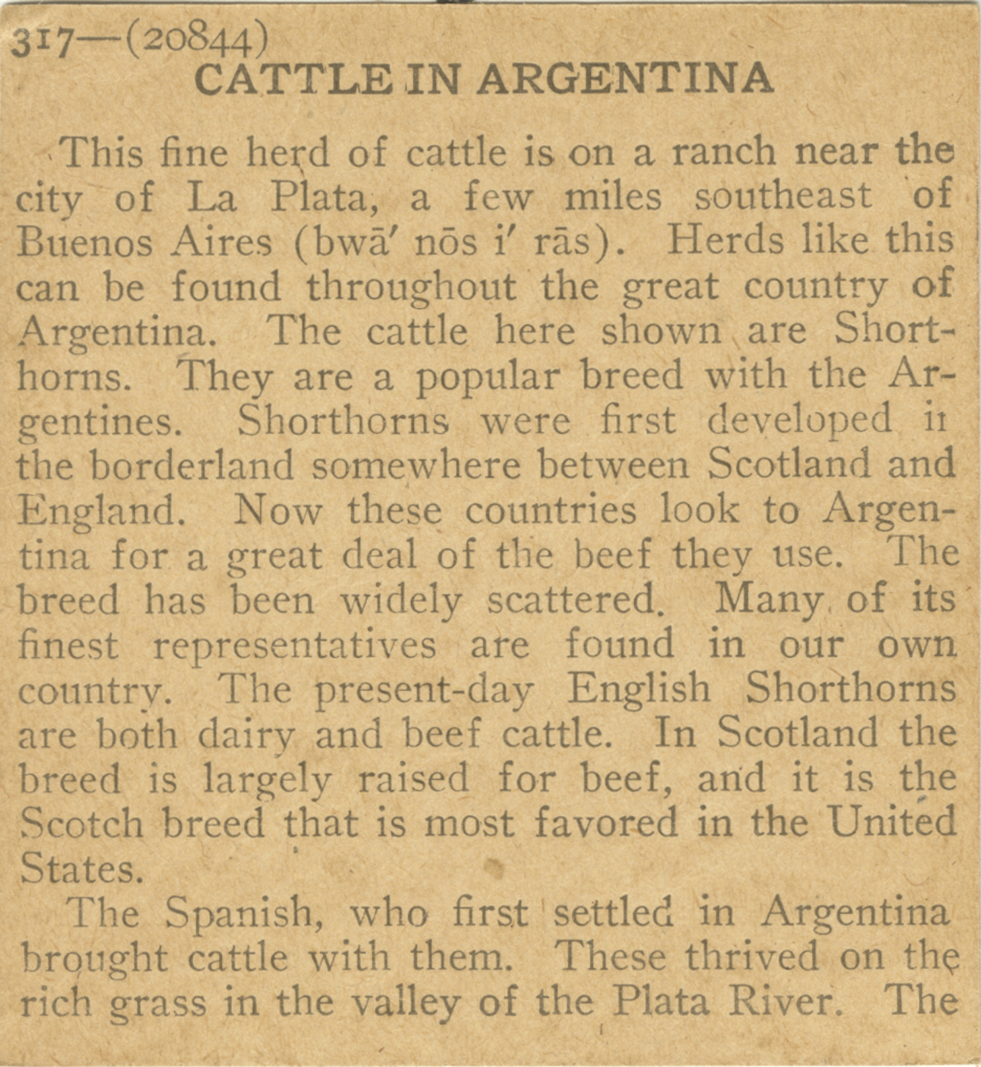 This fine herd of cattle is on a ranch near the city of La Plata, a few miles southeast of Buenos Aires. Herds like this can be found throughout the great country of Argentina. The cattle here shown are Shorthorns. They are a popular breed with the Argentines. Shorthorns were first developed in the borderland somewhere between Scotland and England. Now these countries look to Argentina for a great deal of the beed they use. The breed has been widely scattered. Many of its finest representatives are found in our own country. The present-day English Shorthorns are both dairy and beef cattle. In Scotland the breed is largely raised for beef, and it is the Scotch breed that is most favored in the United States. The Spanish, who first settled in Argentina brought cattle with them. These thrived on the rich grass in the valley of the Plata River. The