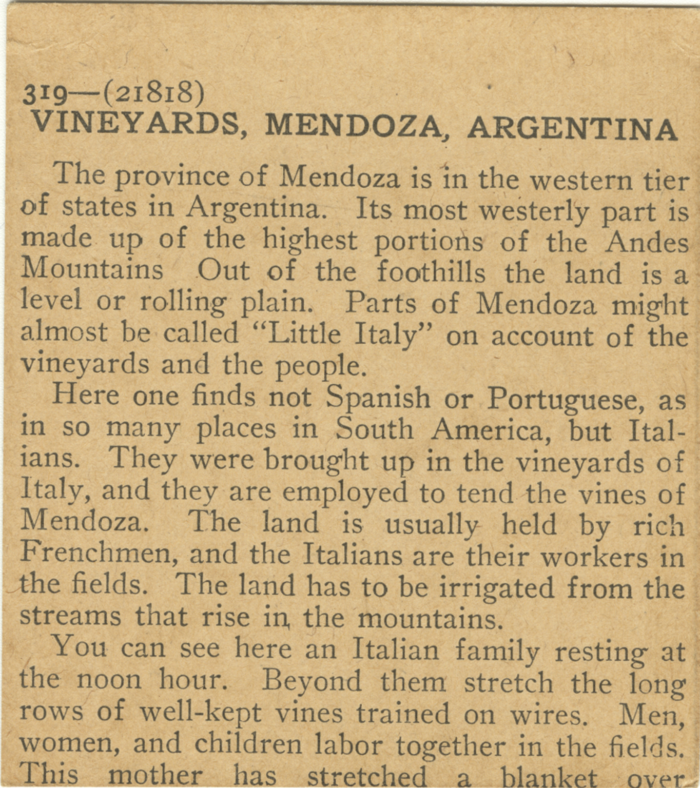 The province of Mendoza is in the western tier of states in Argentina. Its most westerly part is made up of the highest portions of the Andes Mountains. Out of the foothills the land is a level or rolling plain. Parts of Mendoza might almost be called "Little Italy" on account of the vineyards and the people. Here one finds not Spanish or Portuguese, as in so many places in South America, but Italians. They were brought up in the vineyards of Italy, and they are employed to tend the vines of Mendoza. The land is usually held by rich Frenchmen, and the Italians are their workers in the fields. The land has to be irrigated from the streams that rise in the mountains. You can see here an Italian family resting at the noon hour. Beyond them stretch the long rows of well-kept vines trained on wires. Men, women, and children labor together in the fields. This mother has stretched a blanket over