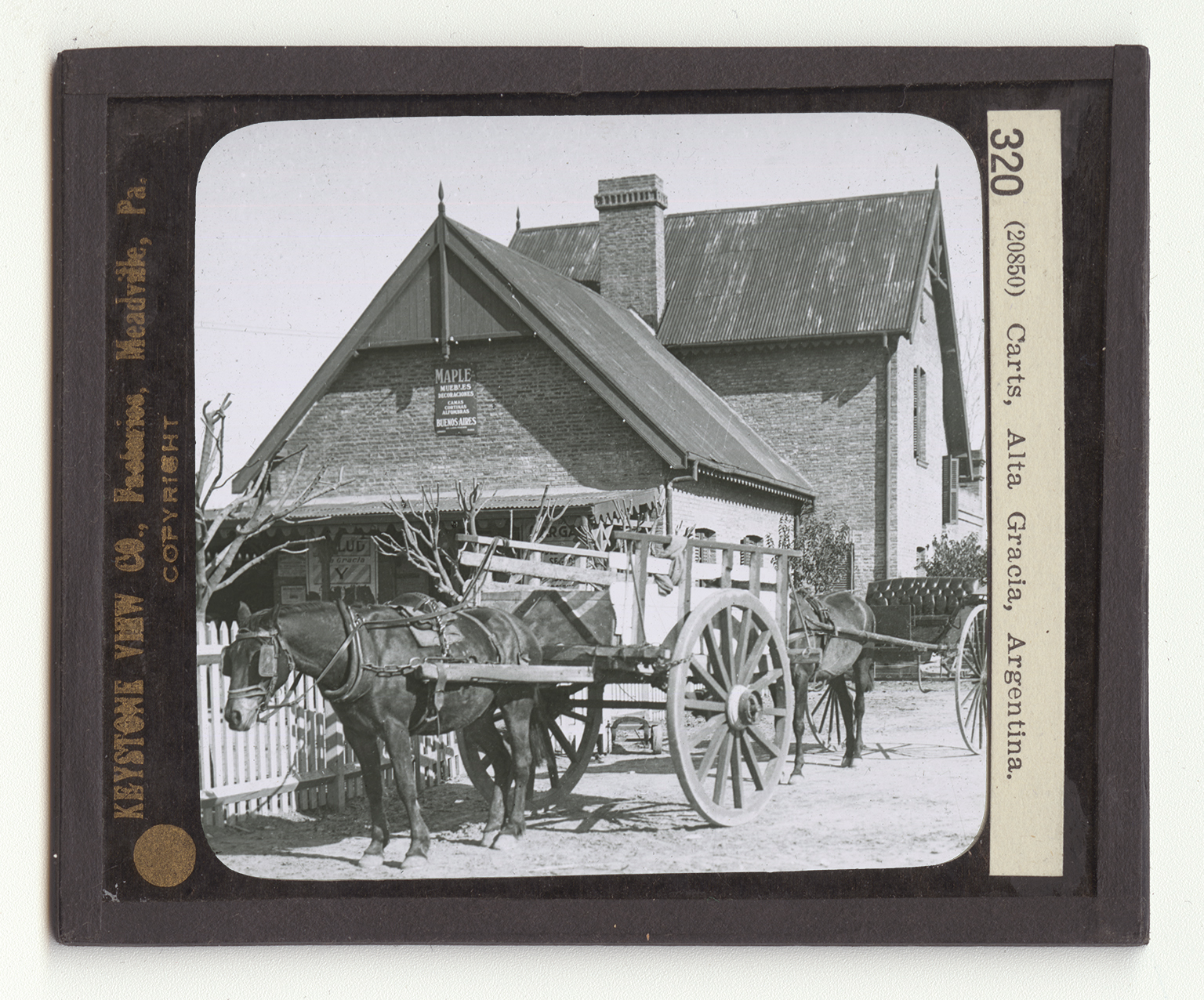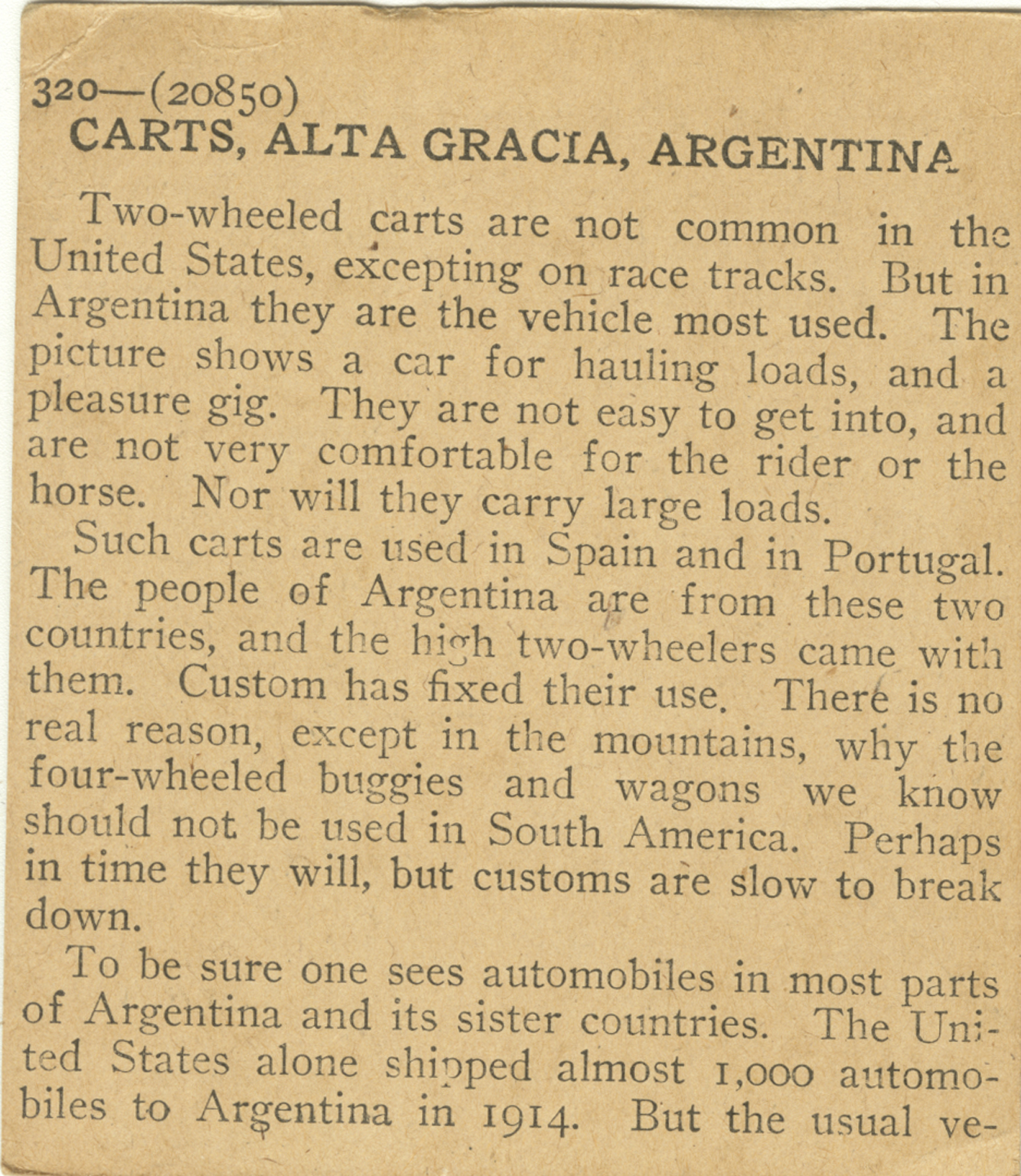 Two-wheeled carts are not common in the United States, excepting on race tracks. But in Argentina they are the vehicle most used. The picture shows a car for hauling loads, and a pleasure gig. They are not easy to get into, and are not very comfortable for the rider or the horse. Nor will they carry large loads. Such carts are used in Spain and in Portugal. The people of Argentina are from these two countries, and the high two-wheelers came with them. Custom has fixed their use. There is no real reason, except in the mountains, why the four-wheeled buggies and wagons we know should not be used in South America. Perhpas in time they will, but customs are slow to break down. To be sure one sees automobiles in most parts of Argentina and its sister countries. The United States alone shipped almost 1,000 automobiles to Argentina in 1914. But the usual ve-