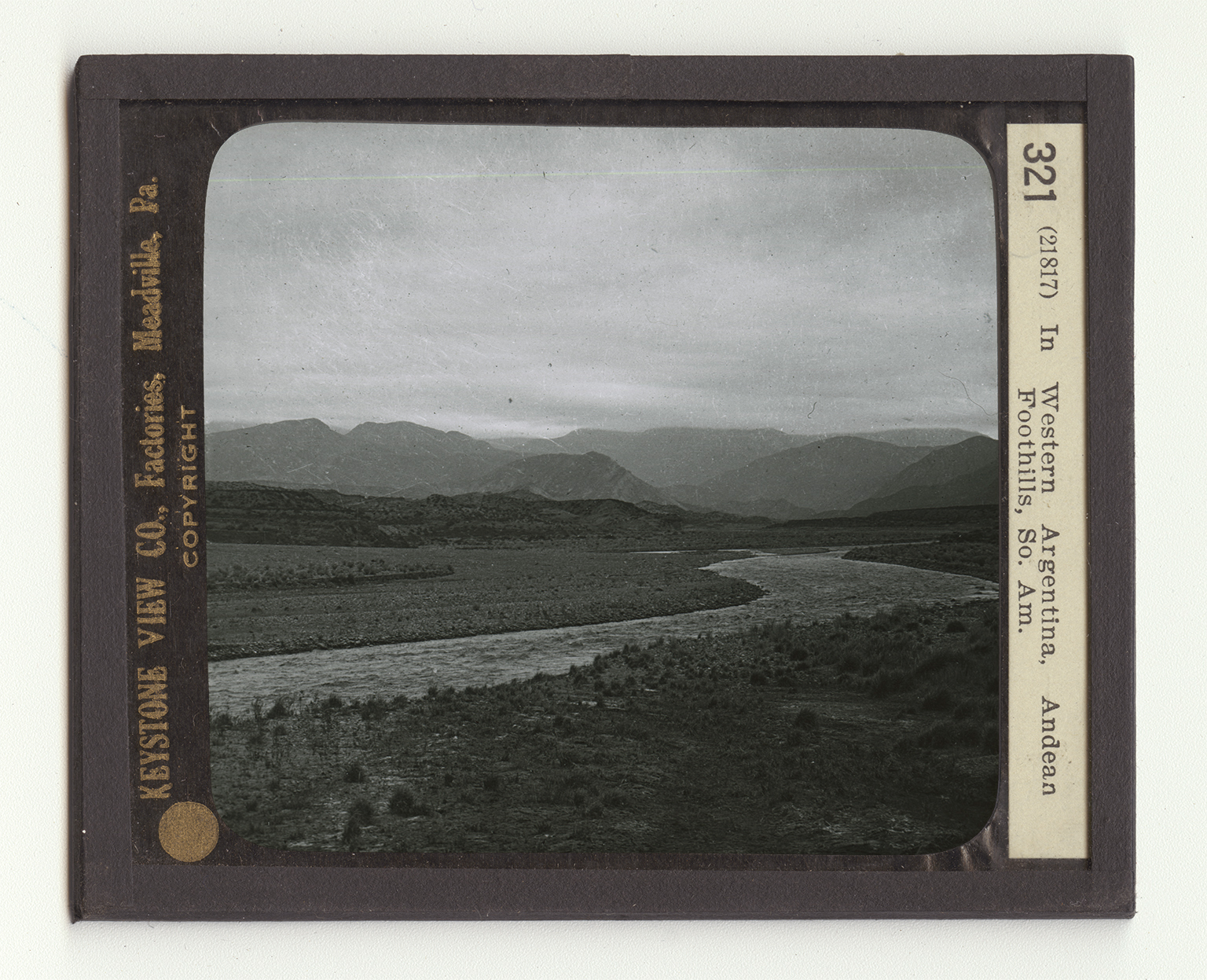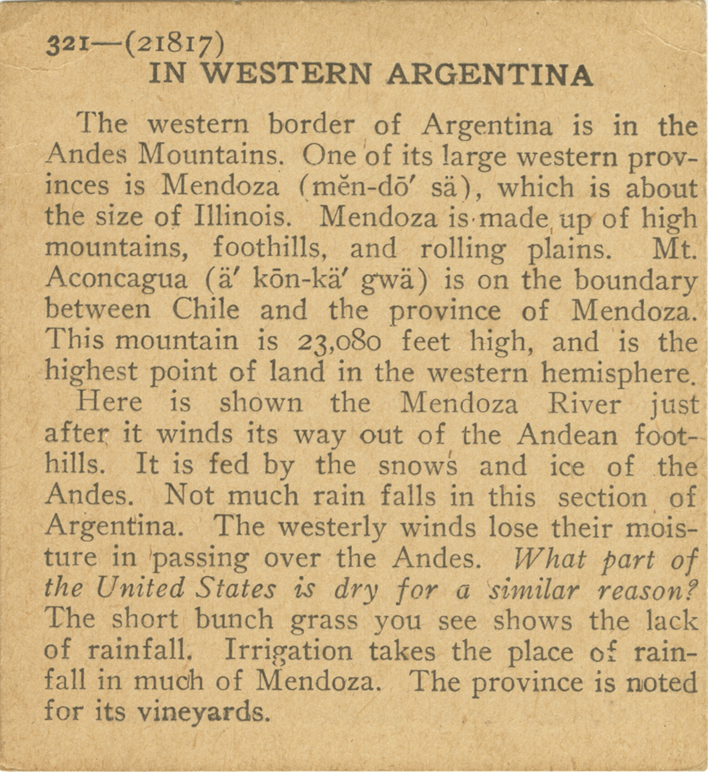 The western border of Argentina is in the Andes Mountains. One of its large western provinces is Mendoza which is about the size of Illinois. Mendoza is made up of high mountains, foothills, and rolling plains. Mt. Aconcagua is on the boundary between Chile and the province of Mendoza. This mountain is 23,080 feet high, and is the highest point of land in the western hemisphere. Here is shown the Mendoza River just after it winds its way out of the Andean foothills. It is fed by the snows and ice of the Andes. Not much rain falls in this section of Argentina. The westerly winds lose their moisture in passing over the Andes. What part of the United States is dry for a similar reason? The short bunch grass you see shows the lack of rainfall. Irrigation takes the place of rainfall in much of Mendoza. The province is noted for its vineyards.