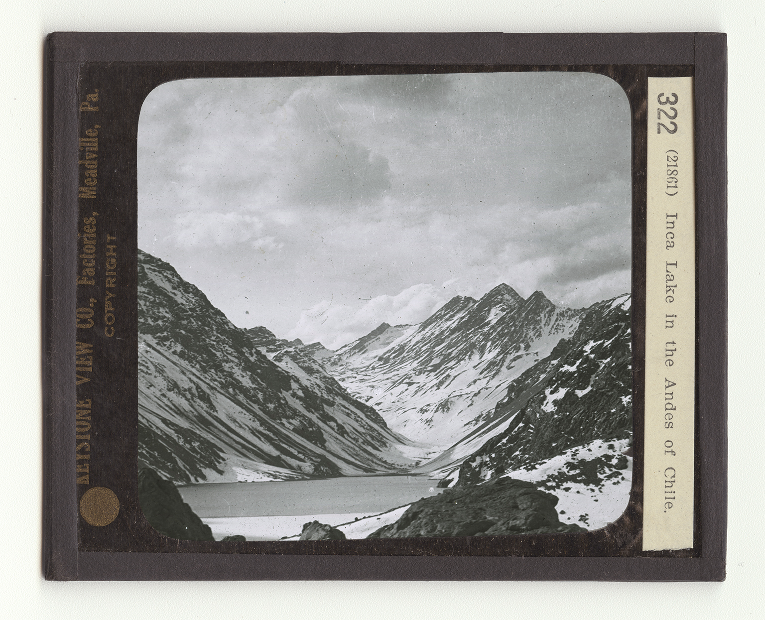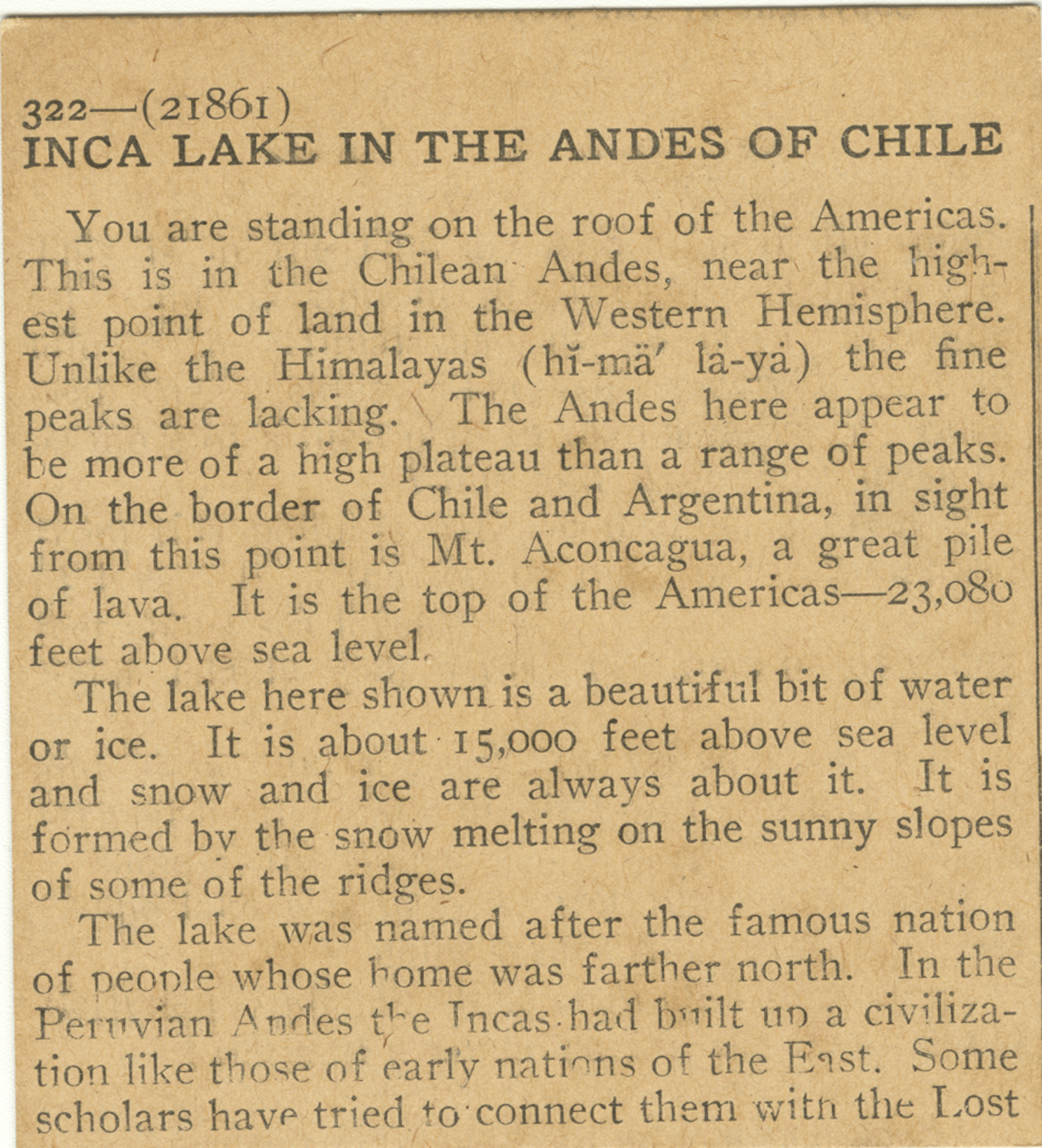 You are standing on the roof of the Americas. This is in the Chilean Andes, near the highest point of land in the Western Hemisphere. Unlike the Himalayas the fine peaks are lacking. The Andes here appear to be more of a high plateau than a range of peaks. On the border of Chile and Argentina, in sight from this point is Mt. Aconcagua, a great pile of lava. It is the top of the Americas - 23,080 feet above sea level. The lake here shown is a beautiful bit of water or ice. It is about 15,000 feet above sea level and snow and ice are always about it. It is formed by the snow melting on the sunny slopes of some of the ridges. The lake was named after the famous nation of people whose home was farther north. In the Peruvian Andes the Incas had built up a civilization like those of early nations of the East. Some scholars have tried to connect them with the Lost