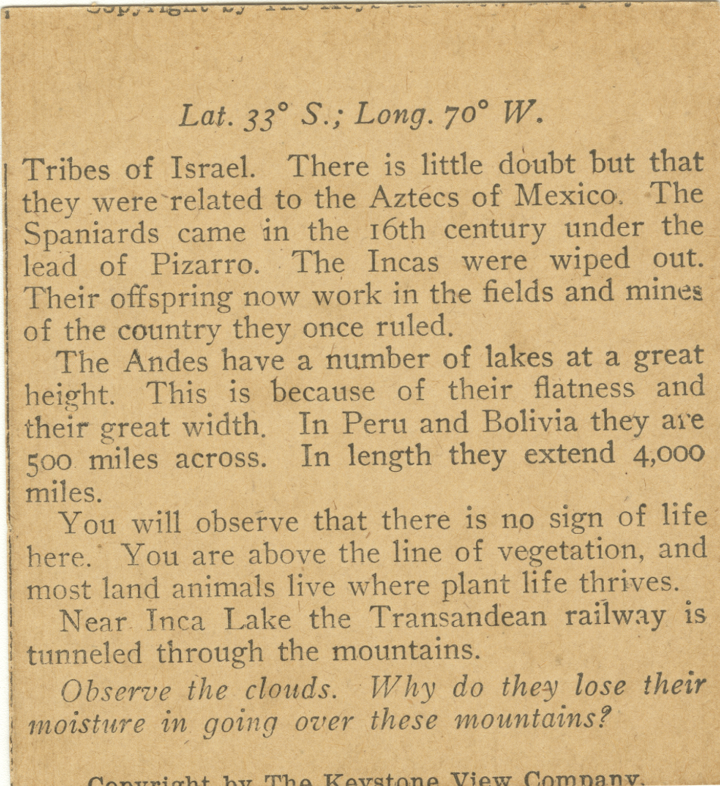 Tribes of Israel. There is little doubt but that they were related to the Aztecs of Mexico. The Spaniards came in the 16th century under the lead of Pizarro. The Incas were wiped out. Their offspring now work in the fields and mines of the country they once ruled. The Andes have a number of lakes at a great height. This is because of their flatness and their great width. In Peru and Bolivia they are 500 miles across. In lenght they extend 4,000 miles. You will observe that there is no sign of life here. You are above the line of vegetation, and most land animals lived where plant life thrives. Near Inca Lake the Transandean railway is tunneled through the mountains. Observe the clouds. Why do they lose their moisture in going over these mountains?
