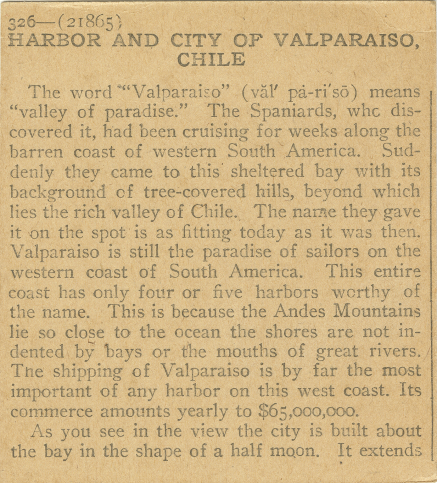 The word "Valparaiso" means "valley of paradise." The Spaniards who discovered it, had been cruising for weeks along the barren coast of western South America. Suddenly they came to this sheltered bay with its background of tree-covered hills, beyond which lies the rich valley of Chile. The name they gave it on the spot is as fitting today as it was then. Valparaiso is still the paradise of sailors on the western coast of South America. This enitre coast has only four or five harbors worthy of the name. This is because the Andes Mountains lie so close to the ocean the shores are not indented by bays or the mouths of great rivers. The shipping of Valparaiso is by far the most important of any harbor on this west coast. Its commerce amounts yearly to $65,000,000. As you see in the view the city is built about the bay in the shape of a half moon. It extends