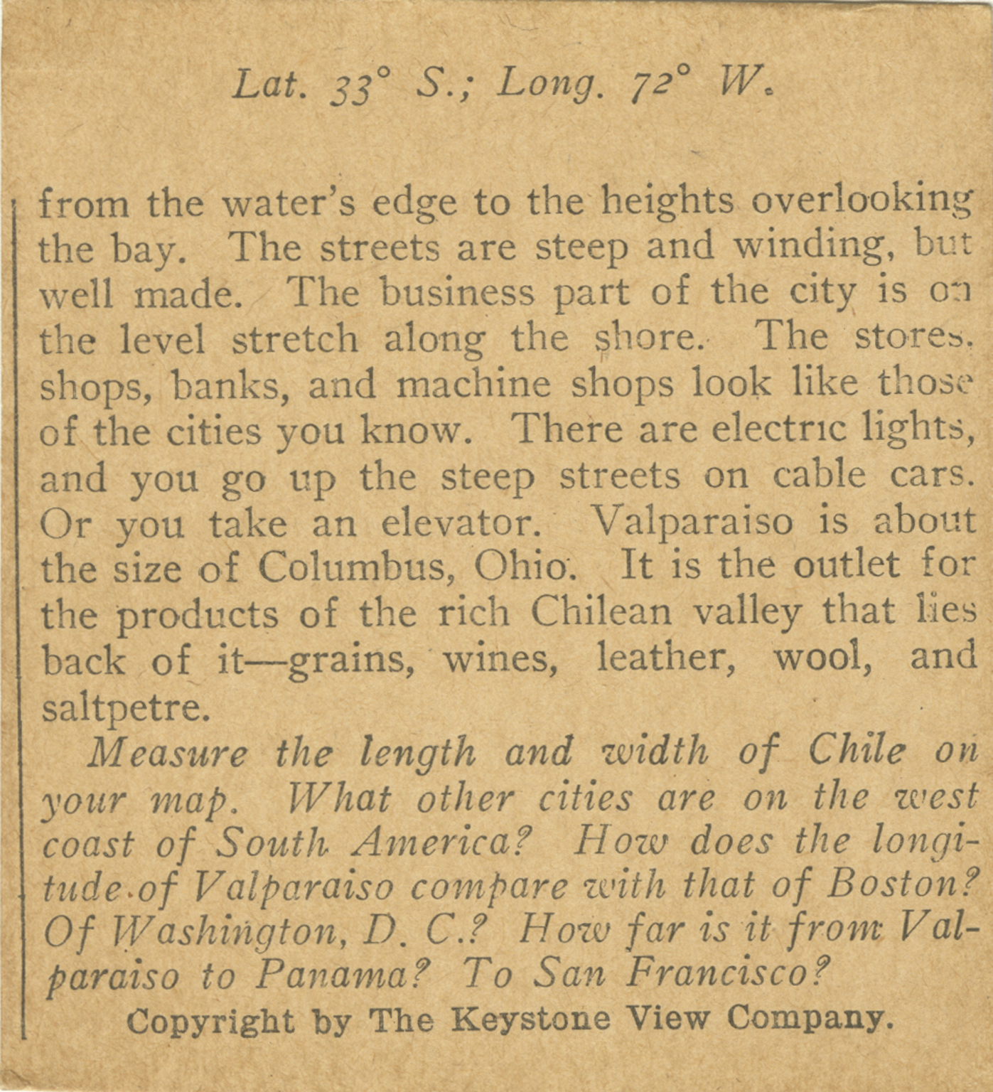 from the water's edge to the heights overlooking the bay. The streets are steep and winding, but well made. The business part of the city is on the level, stretch along the shore. The stores, shops, banks, and machine shops look like those of the cities you know. There are electric lights, and you go up the steep streets on cable cars. Or you take an elevator. Valparaiso is about the size of Columbus, Ohio. It is the outlet for the products of the rich Chilean valley that lies back of it - grains, wines, leather, wool, and saltpetre. Measure the lenght and width of Chile on your map. What other cities are on the west coast of South America? How does the longitude of Valparaiso comprare with that of Boston? Of Washington, D.C.? How far is it from Valparaiso to Panama? To San Francisco?