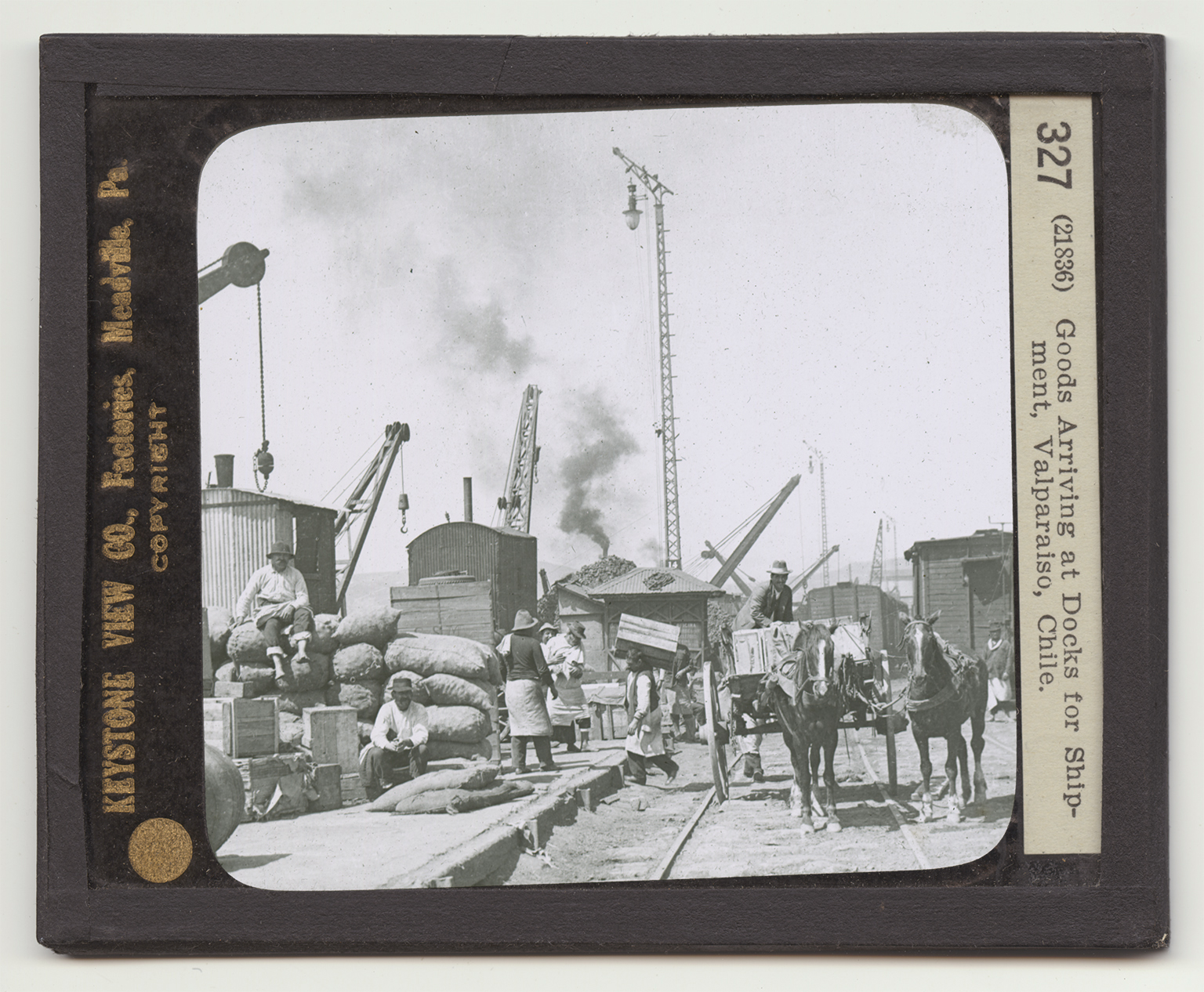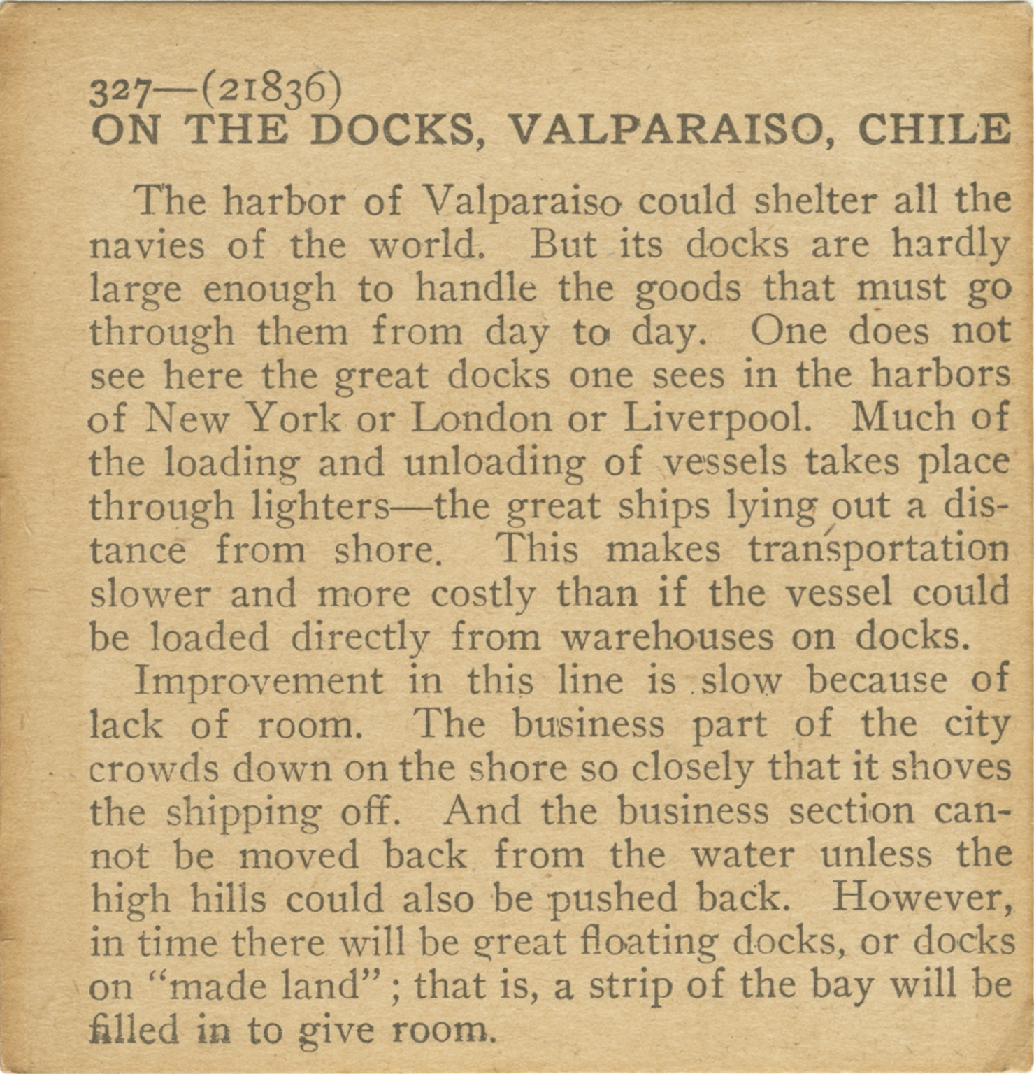 The harbor of Valparaiso could shelter all the navies of the world. But its docks are hardly large enough to handle the goods that must go through them from day to day. One does not see here the great docks one sees in the harbors of New York or London or Liverpool. Much of the loading and unloading of vessels takes place through lighters - the great ships lying out a distance from shore. This makes transportation slower and more costly than if the vessel could be loaded directly from warehouses on docks. Improvement in this line is slow because of lack of room. The business part of the city crowds down on the shore so closely that it shoves the shipping off. And the business section cannot be moved back from the water unless the high hills could also be pushed back. However, in time there will be great floating docks, or docks on "made land"; that is a strip of the bat will be fitted in to give room.