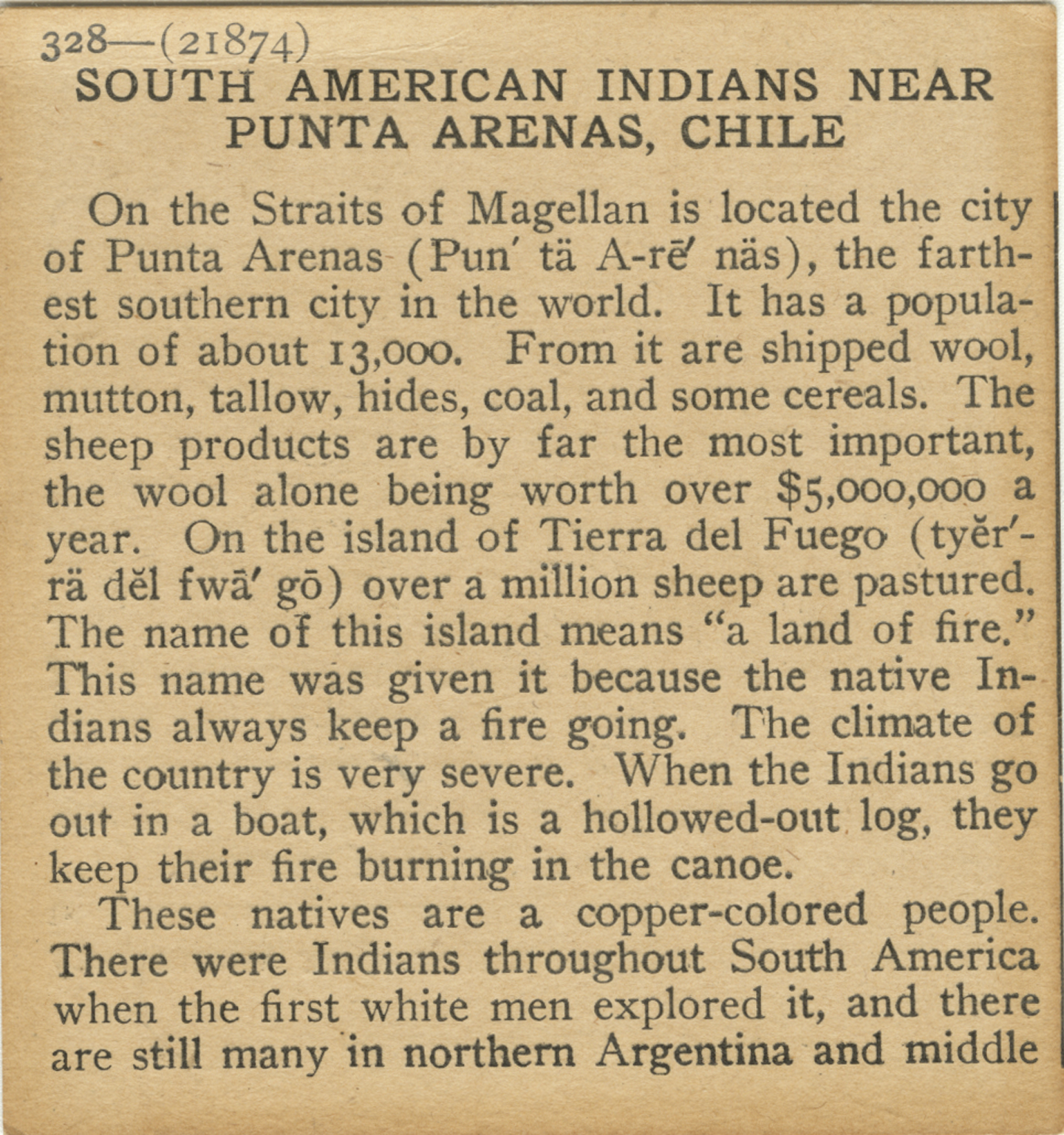 On the Straits of Magellan is located the city of Punta Arenas , the farthest southern city in the world. It has a population of about 13,000. From it are shipped wool, mutton, tallow, hides, coal, and some cereals. The sheep products are by far the most important, the wool alone being worth over $5,000,00 a year. On the island of Tierra del Fuego over a million sheep are pastured. The name of this island means "a land of fire." This name was given it because the native Indians always keep a fire going. The climate of the country is very severe. When the Indians go out in a boat, which is a hallowed-out log, they keep their fire burning in the canoe. These natives are a copper-colored people. There were Indians throughout South America when the first white men explored it, and there are still many in northern Argentina and middle