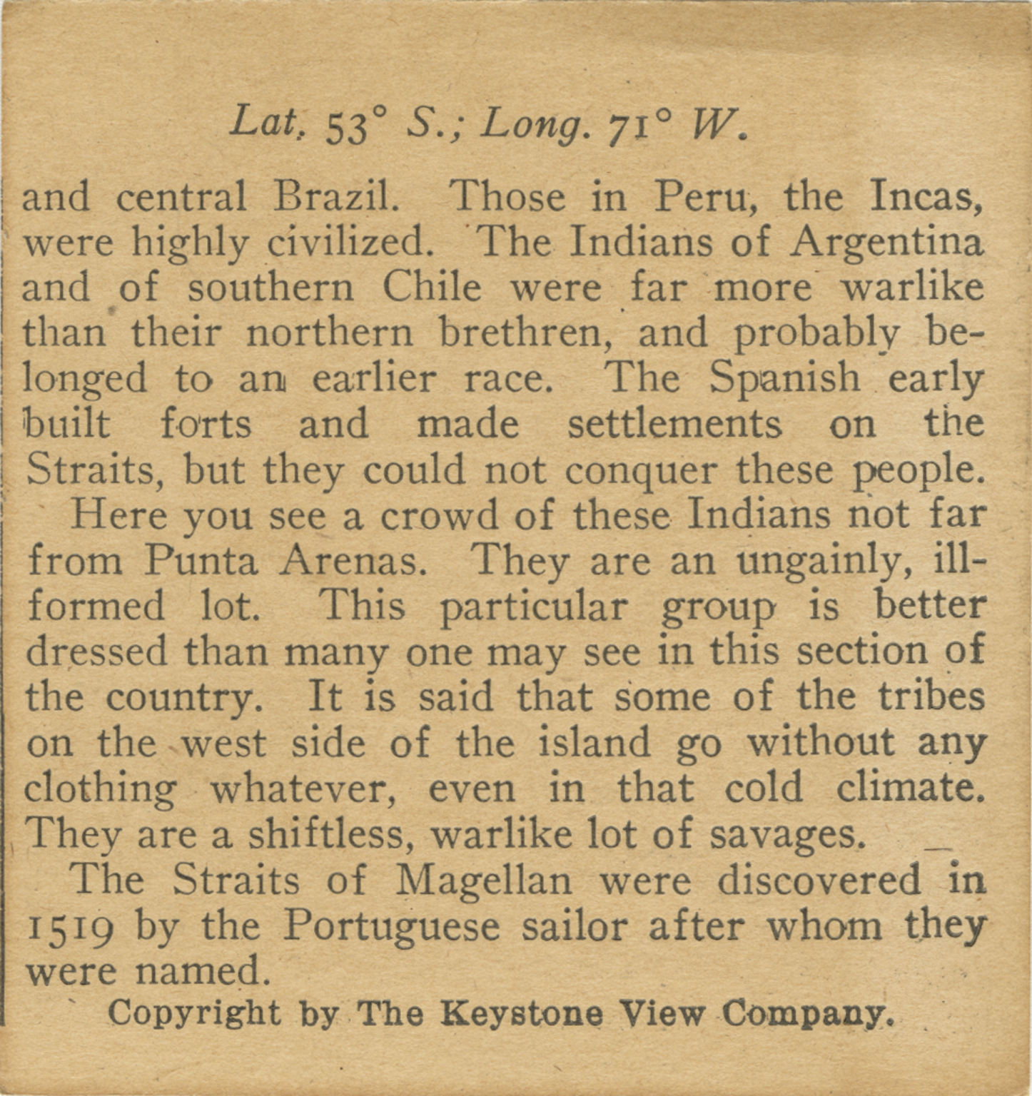 and central Brazil. Those in Peru, the Incas, were highly civilized. The Indians of Argentina and of southern Chile were far more warlike than their northern brethren, and probably belonged to an earlier race. The Spanish early built forts and made settlement on the Straits, but they could not conquer these people. Here you see a crowd of these Indians not far from Punto Arenas. They are an ungainly, ill-formed lot. This particular group is better dressed than many one may see in this section of the country. It is said that some of the tribes on the west side of the island go without any clothing whatever, even in the that cold climate. They are a shiftless, war like lot of savages. The Straits of Magellan were discovered in 1519 by the Portuguese sailor after woman they were named.