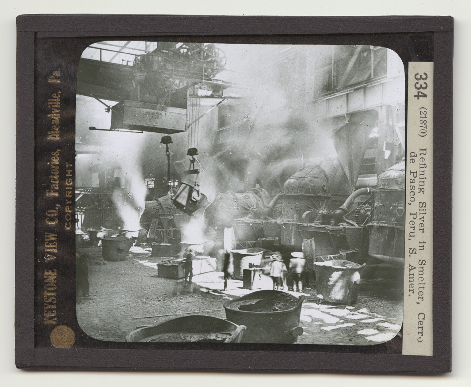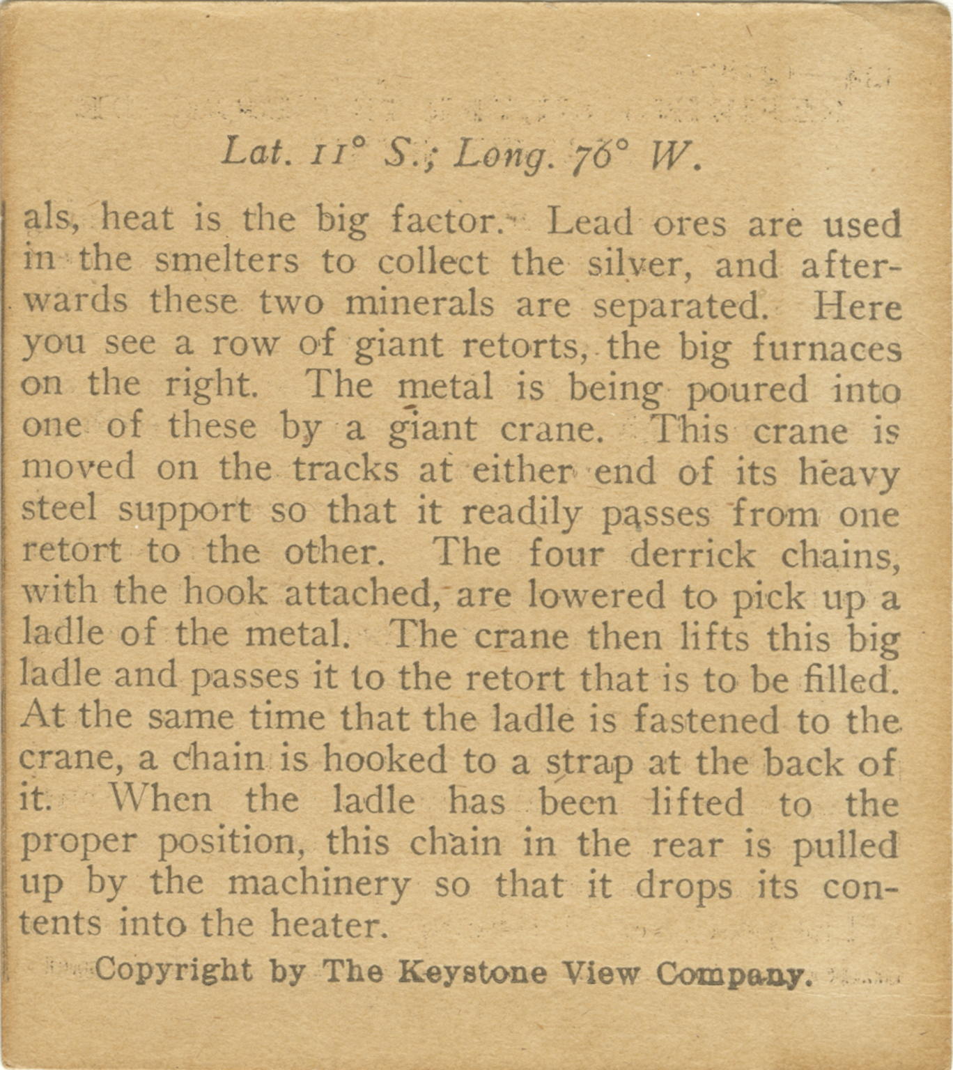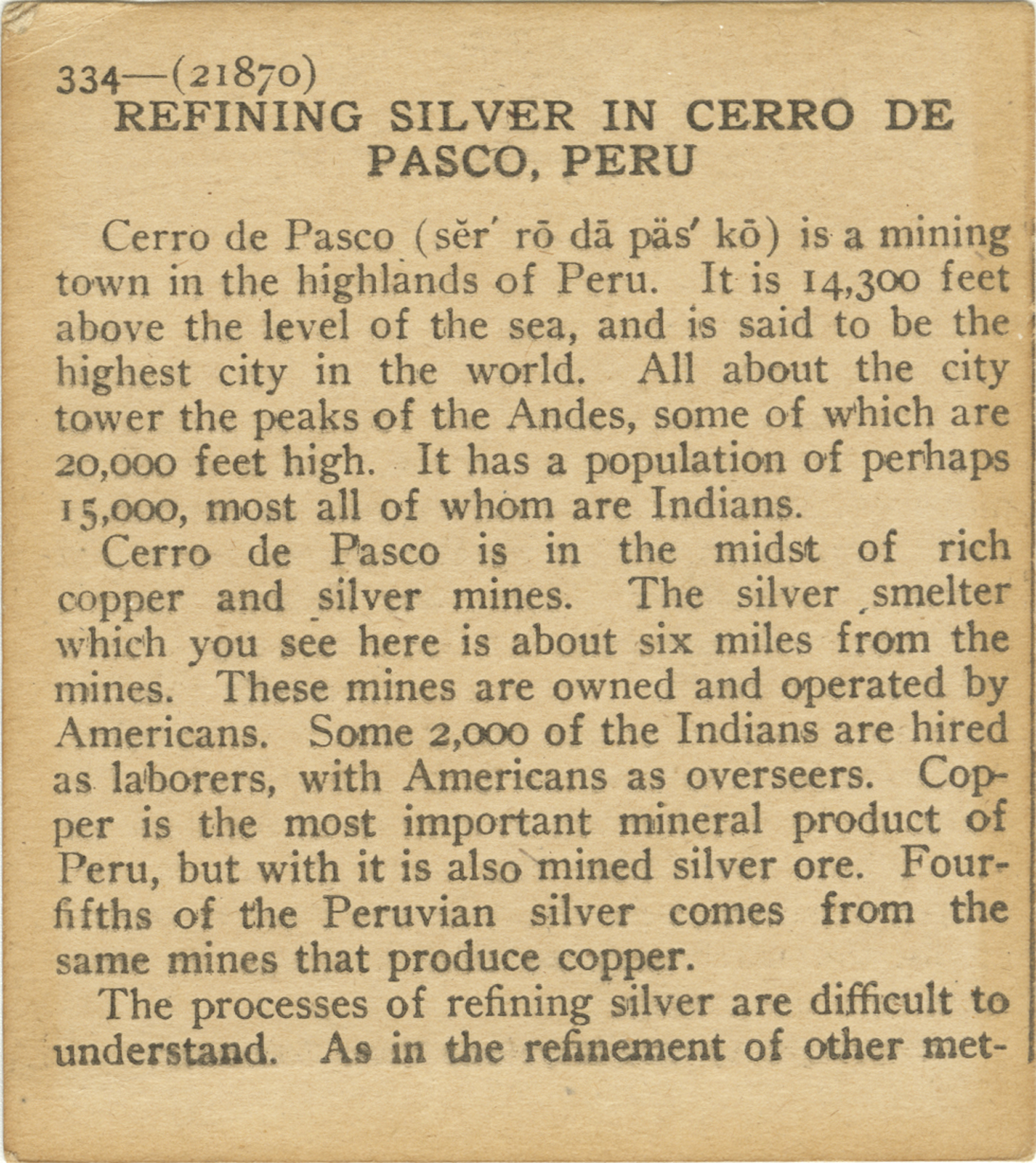 Cerro de Pascois a mining town in the highlands of Peru. It is 14,300 feet above the level of the sea, and is said to be the highest city in the world. All about the city tower the peaks of the Andes, some of which are 20,000 feet high. It has a population of perhaps 15,000, most all of whom are Indians. Cerro de Pasco is in the midst of rich copper and silver mines. The silver smelter which you see here is about six miles form the mines. These mines are owned and operated by Americans. Some 2,000 of the Indians are hired as laborers, with Americans as overseers. Copper is the most important mineral product of Peru, but with it is also mined silver ore. Four-fifths of the Peruvian silver comes from the same mines that produce copper. The processes of refining silver are difficult to understand. As in the refinement of other met-