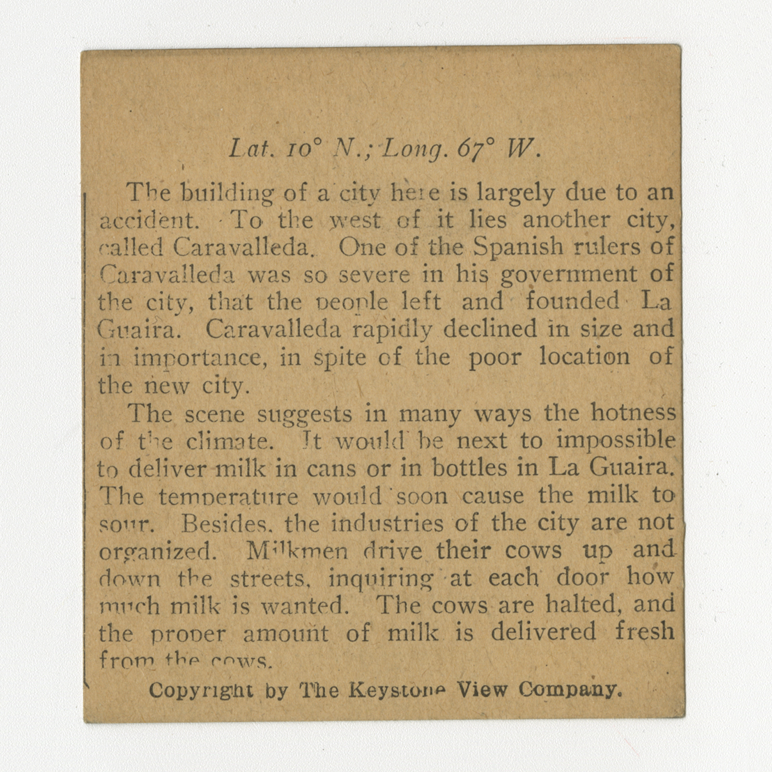 The building of a city here is largely due to an accident. To the west of it lies another city, called Caravelleda. One of the Spanish rulers of Caravalleda was so severe in his government of the city, that the people left and founded La Guira. Caravalleda rapidly declined in size and in importance, in spite of the poor location of the new city. The scene suggests in many ways the hotness of the climate. It would be next to impossible to deliver milk in cans or in bottles in La Guira. The temperature would soon cause the milk to sour. Besides the industries of the city are not organized. Milkmen drive their cows up and down the streets, inquiring at each door how much milk is wanted. The cows are halted, and the proper amount of milk is delivered fresh from the cows.