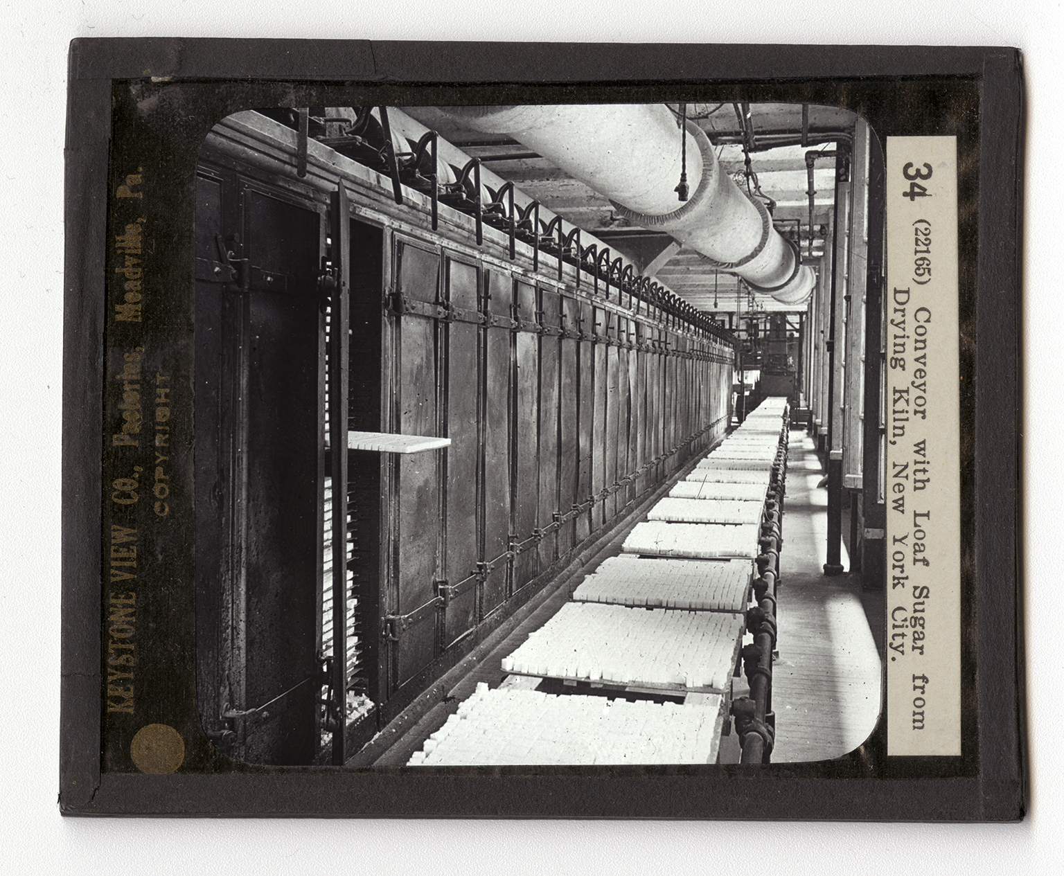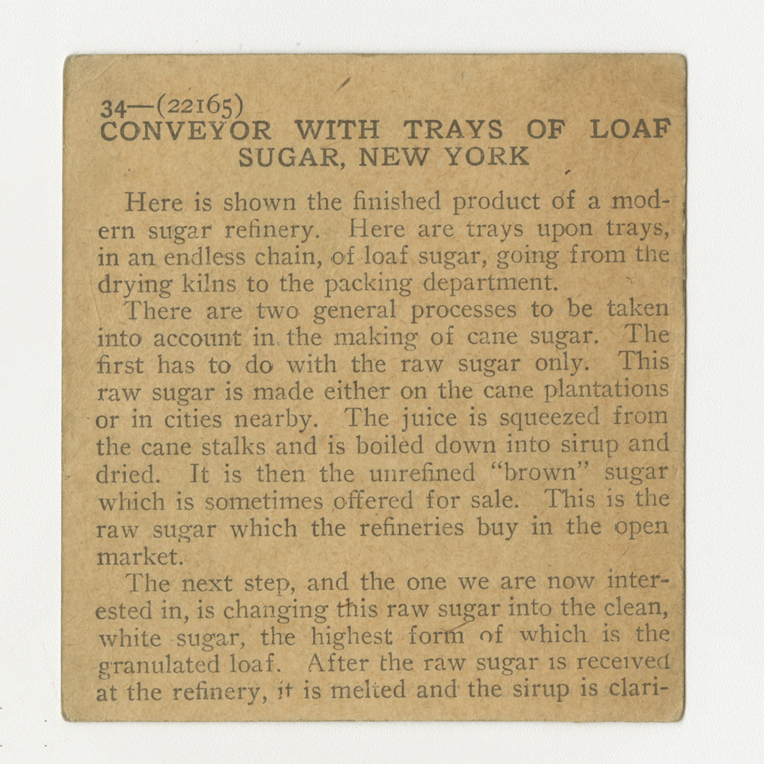 Here is shown the finished product of a modern sugar refinery. Here are trays upon trays, in an endless chain, of loaf sugar, going from the drying kilns to the packing department. There are two general processes to be taken into account in the making of cane sugar. The first has to do with the raw sugar only. This raw sugar is made either on the cane plantations or in cities nearby. The juice is squeezed from the cane stalks and is boiled down into sirup and dried. It is then unrefined "brown" sugar which is sometimes offered for sale. This is the raw sugar which the refineries buy in the open market. The next step, and the one we are now interested in, is changing the raw sugar into the clean, white sugar, the highest form of which is the granulated loaf. After the raw sugar is received at the refinery, it is melted and the sirup is clari-