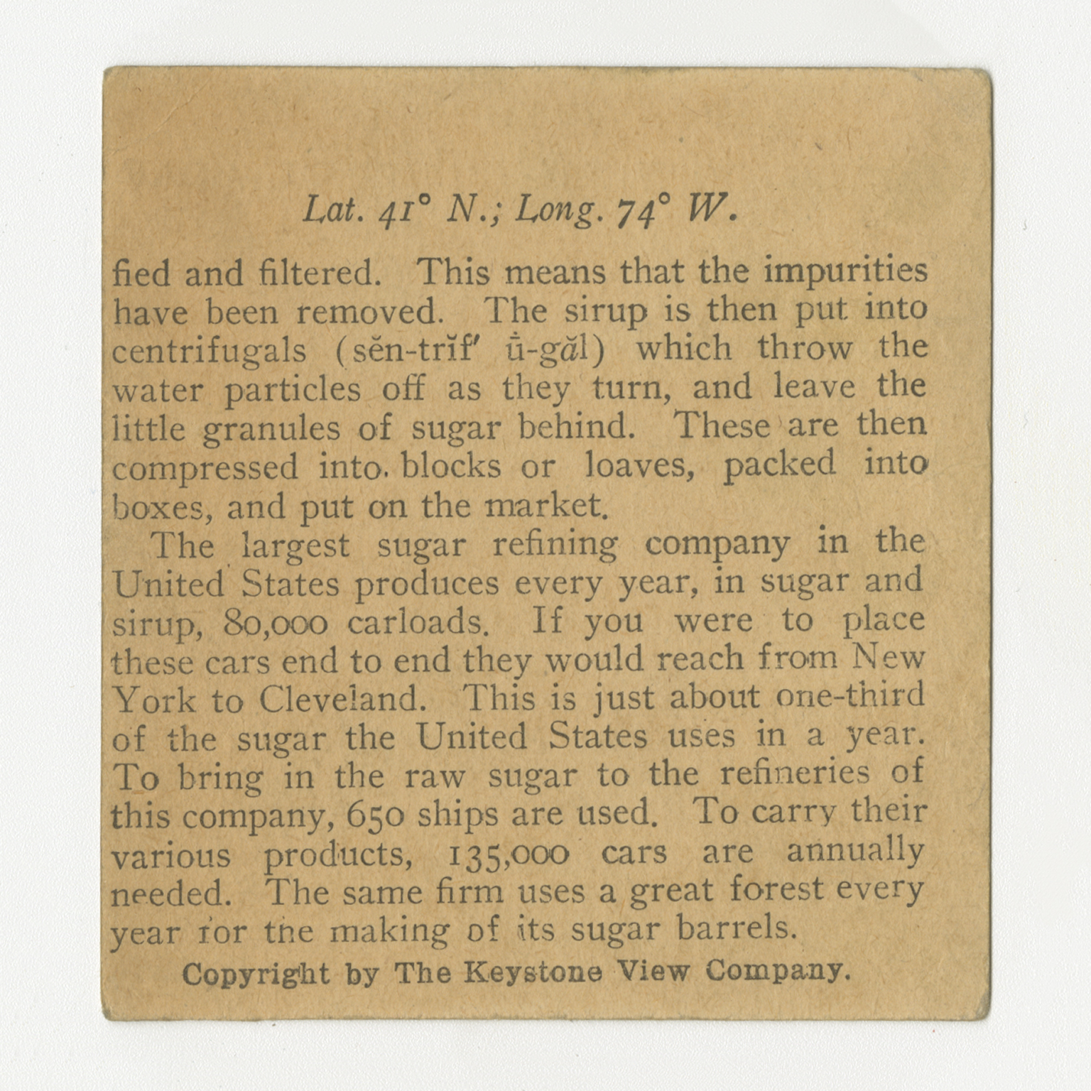 fied and filtered. This means that the impurities have been removed. The sirup is then put into centrifugals which throw the water particles off as they turn, and leave the little granules of sugar behind. These are then compressed into blocks or loaves, packed into boxes, and put on the market. The largest sugar refining company in the United States produces every year, in sugar and sirup, 80,000 carloads. If you were to place these cars end to end they would reach from New York to Cleveland. This is just about one-third of the sugar the United States uses in a year. To bring in the raw sugar to the refineries of this company, 650 ships are used. To carry their various products, 135,000 cars are annually needed. The same firm uses a great forest every year for the making of its sugar barrels.