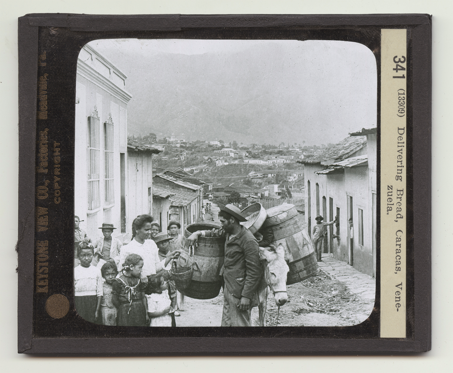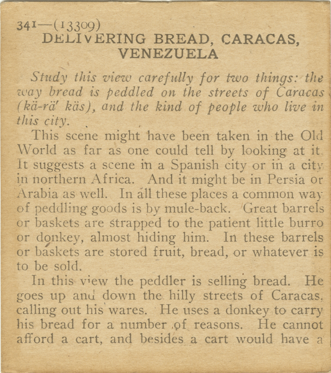 Study this view carefully for two things; the way bread is peddled on the streets of Caracas, and the kind of people who live in this city. This scene might have been taken in the Old World as far as one could tell by looking at it. It suggests as a scene in a Spanish city or in a city in northern Africa. And it might be in Persia or Arabia as well. In all these places a common way of peddling goods is by mule-back. Great barrels or baskets are strapped to the patient little burro or donkey, almost hiding him. In these barrels or baskets are stored fruit, bread, or whatever is to be sold. In this view the peddler is selling bread. He goes up and down the hilly streets of Caracas, calling out his wares. He uses a donkey to carry his bread for a number of reasons. He cannot afford a cart, and besides a cart would have a