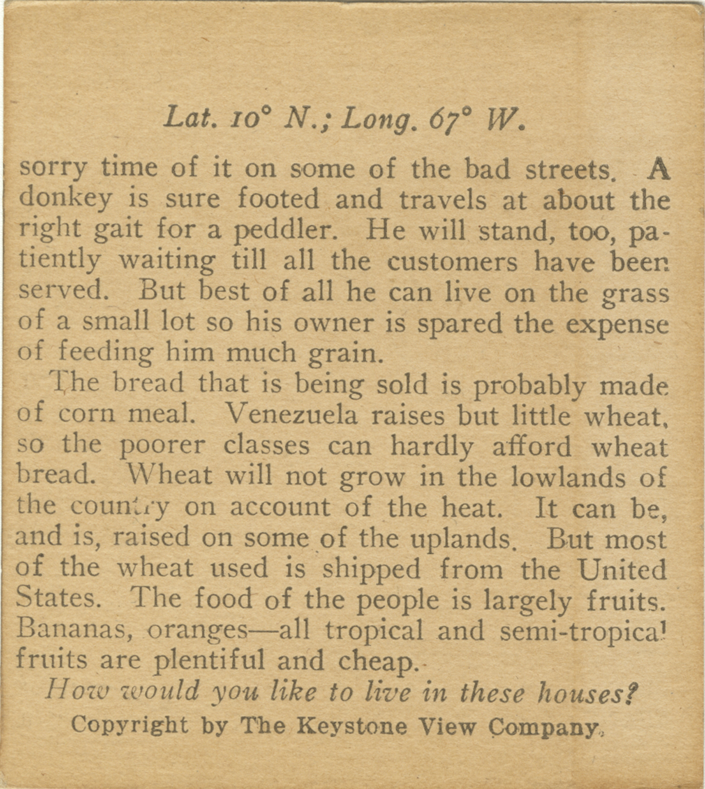 sorry time of it on some of the bad streets. A donkey is sure footed and travels at about the right gait for a peddler. He will stand, too, patiently waiting till all the customers have been served. But best of all he can live on the grass of a small lot so his owner is spared the expense of feeding him much grain. The bread that is being sold is probably made of corn meal. Venezuela raises but little wheat, so the poorer classes can hardly afford wheat bread. Wheat will not grow in the lowlands of the country on account of the heat. It can be, and is, raised on some of the uplands. But most of the wheat used is shipped from the United States. The food of the people is largely fruits. Bananas, oranges - all tropical and semi-tropical fruits are plentiful and cheap. How would you like to live in these houses?