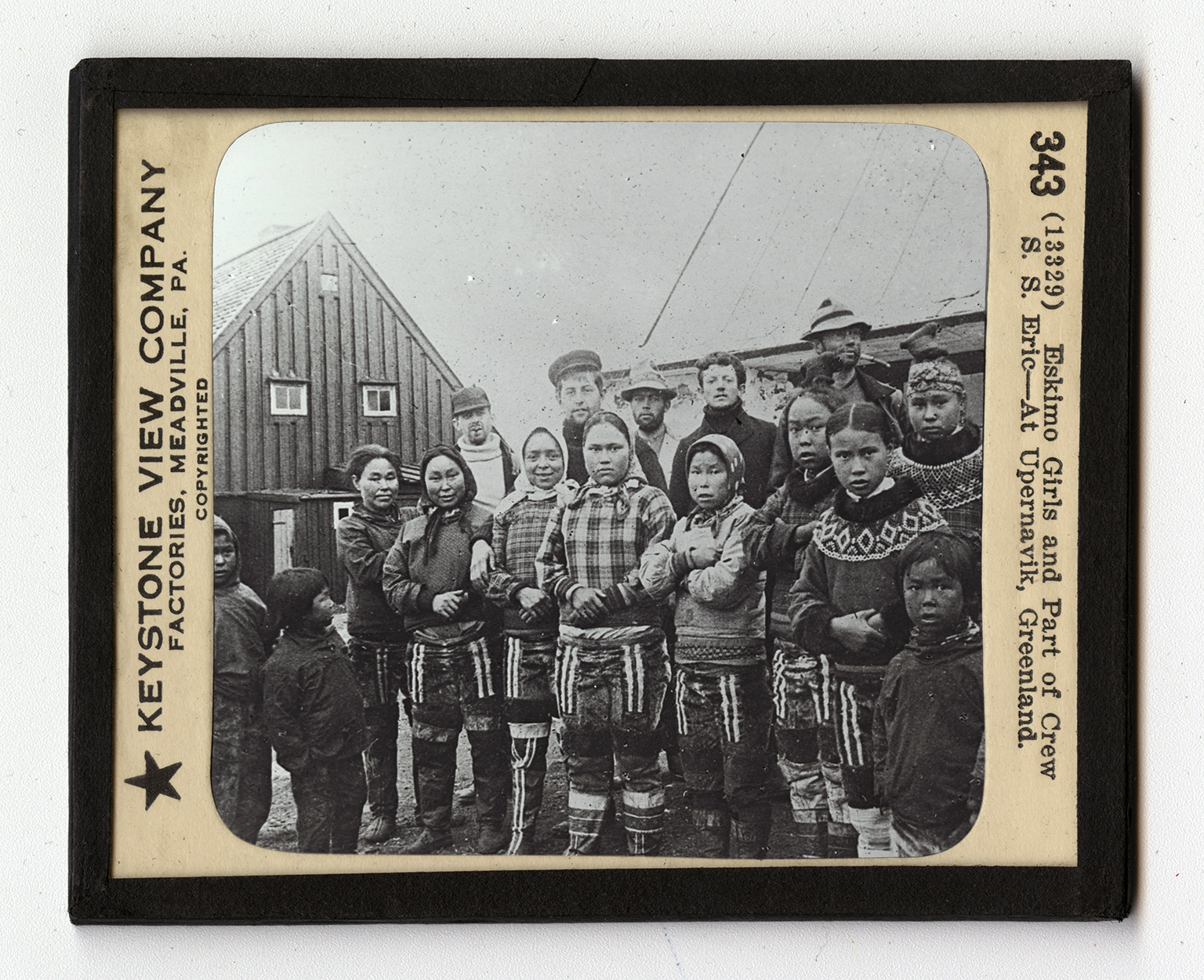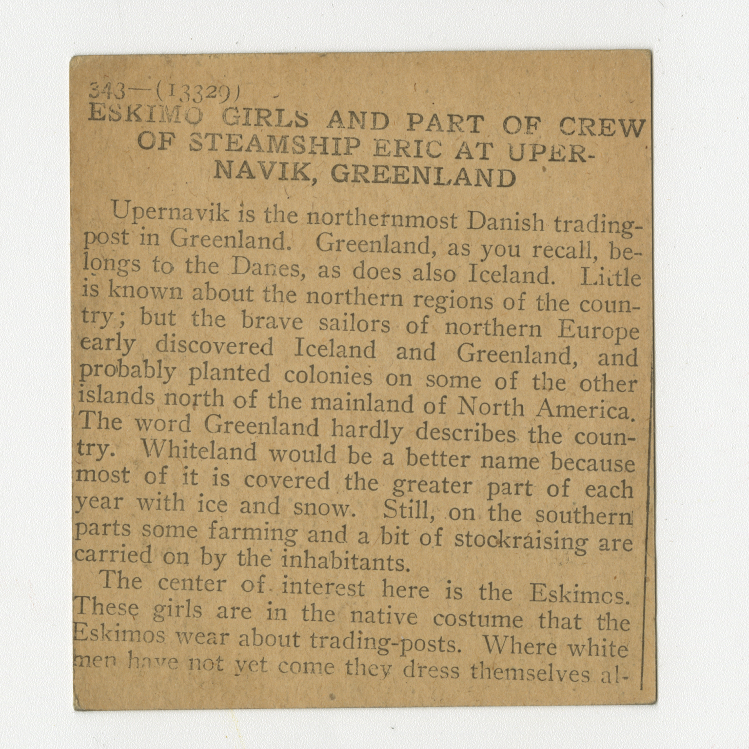 Upernavik is the northernmost Danish tradingpost in Greenland. Greenland, as you recall, belongs to the Danes, as does also Iceland. Little is known about the the northern regions of the country; but the brave sailors of northern Europe probably planted colonies on some of the other islands north of the mainland of North America. The word Greenland hardly describes the country. Whiteland would be a better name because most of it is covered the greater part of each year with ice and snow. Still, on the southern parts some farming and a bit of stoockraising are carried on by the inhabitants. The center of interest here is the Eskimos. These girls are in the native costume that the Eskimos wear about trading-posts. Where white men have not yet come they dress themselves al-