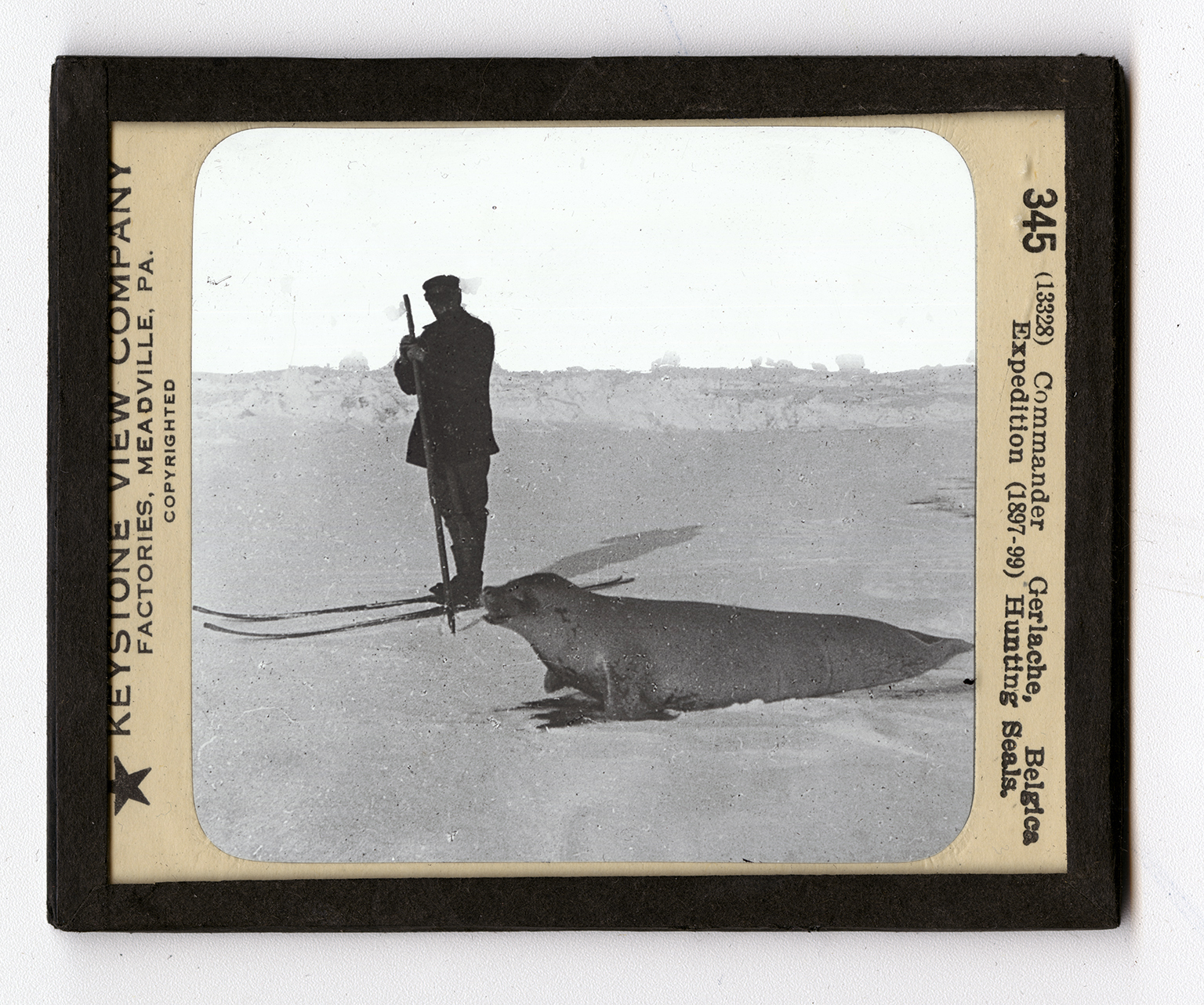 Here is a wonderful view of the South Polar Regions. This is a great stretch of pack ice lying off the coast of the Anarctic Continent. This is the land of eternal snow and ice. Sunrise and sunset on many days are combined. During the winter there is neither sunrise nor sunset. But the dull cold and darkness of the long winter is never-ending. It is the winter season that the men on these Polar Expeditions find hardest to live through. There were only 19 persons, 7 officicers and 12 marines on the Belgica Expedition. Some of these went crazy because of the terribleness of the cold and the sameness of the days. The Commander of the Belgica is here shown. DeGerlache was a Belgian by birth. Her had spent some time with the seal fishers in the Arctic Ocean. By private subscriptions he succeesed in having the Belgica fitted up for a two-