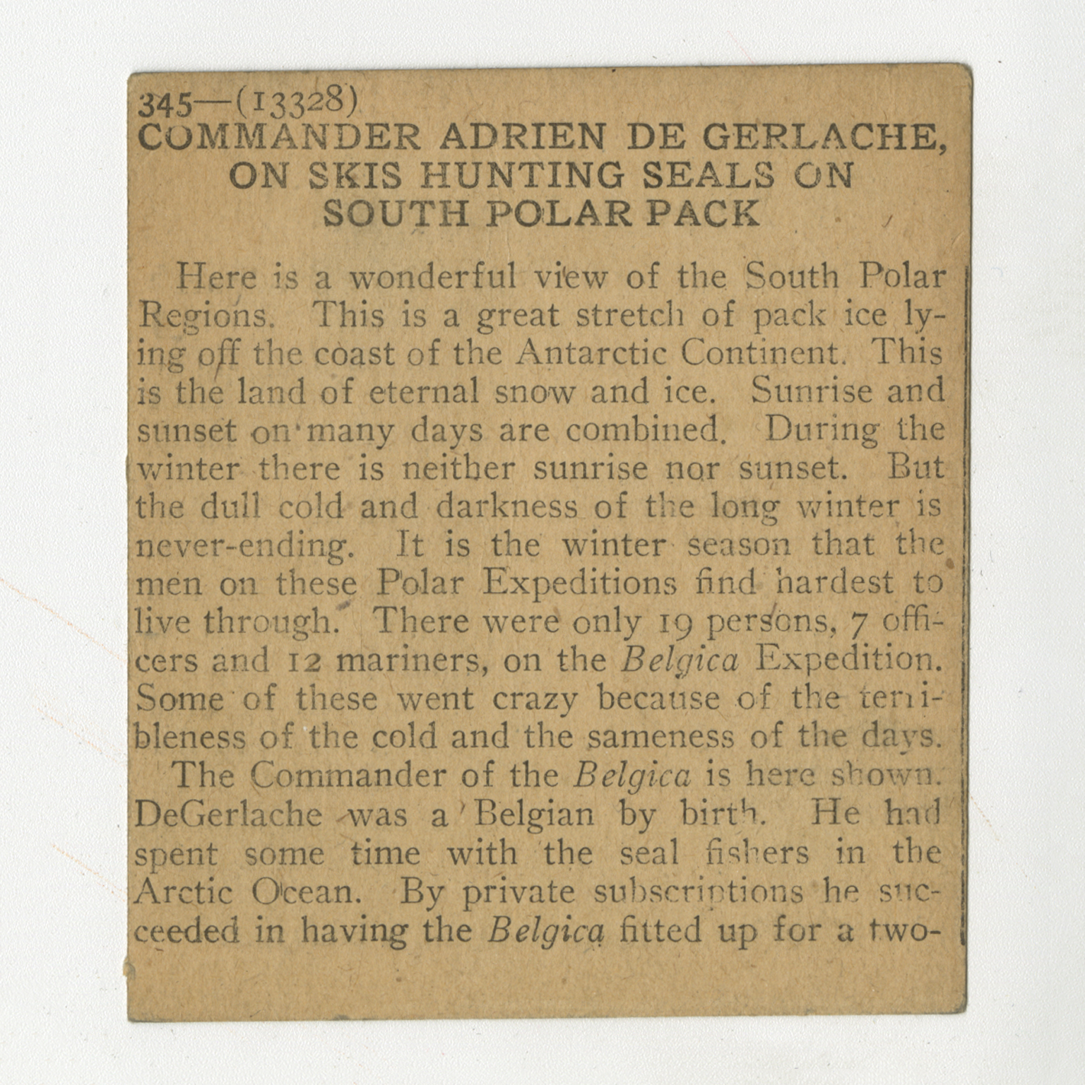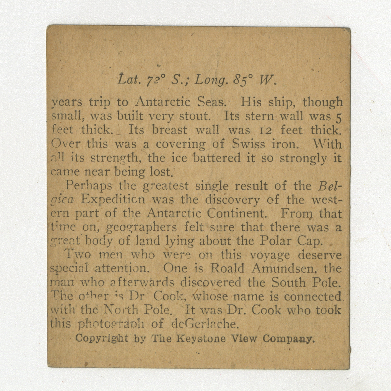 years trip to Antarctic Seas. His ship, though small, was built very stout. Its stern wall was 5 feet thick. Its breast wall was 12 feet thick. Over this was a covering of Swiss iron. With all its strenght, the ice battered it so strongly it came near being lost. Perhaps the greatest single result of the Belgica Expedition was the discovery of the western part of the Antarctic Continent. From that time on, geographers felt sure that there was a great body of land lying about the Polar Cap. Two men who were on this voyage deserve special attention. One is Roald Amundsen, the man who afterwards discovered the South Pole. The other is Dr. Cook, whose name is connected with the North Pole. It was Dr. Cook who took this photograph of deGerlache.