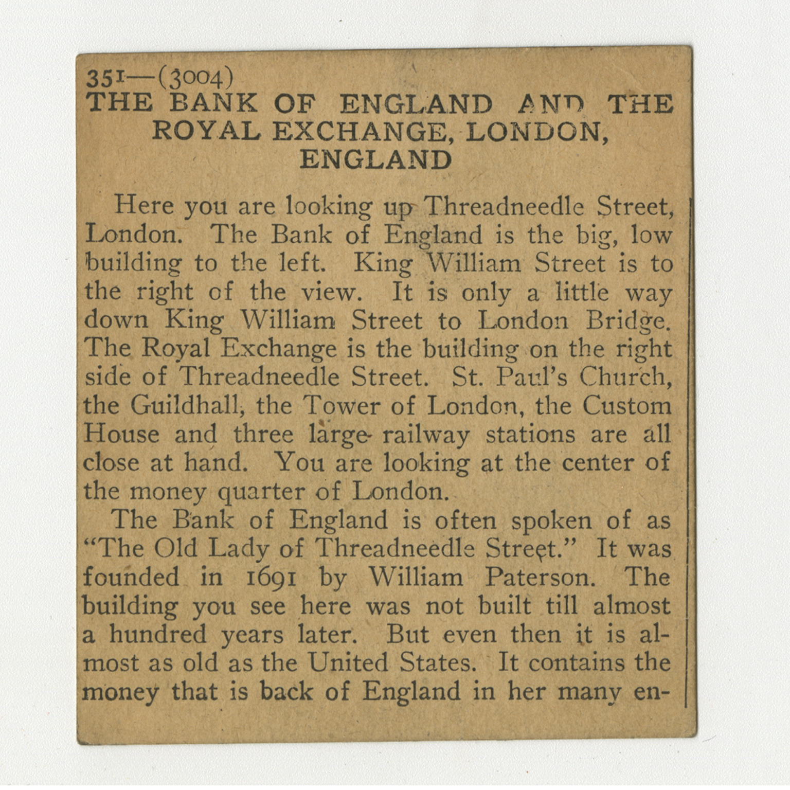 Here you are looking up Threadneedle Street, London. The Bank of England is the big, low building to the left. King William Street is to the right of the view. It is only a little way down King William Street to London Bridge. The Royal Exchange is the building on the right side of Threadneedle Street. St. Paul's Church, the Guidhall, the Tower of London, the Custom House and three large railway stations are all close at hand. You are looking at the center of the money quarter of London. The Bank of England is often spoken of as "The Old Lady of Threadneedle Street." It was founded in 1691 by William Paterson. The building you see here was not built till almost a hundred years later. But even then it is almost as old as the United States. It contains the money that is back of England in her many en-