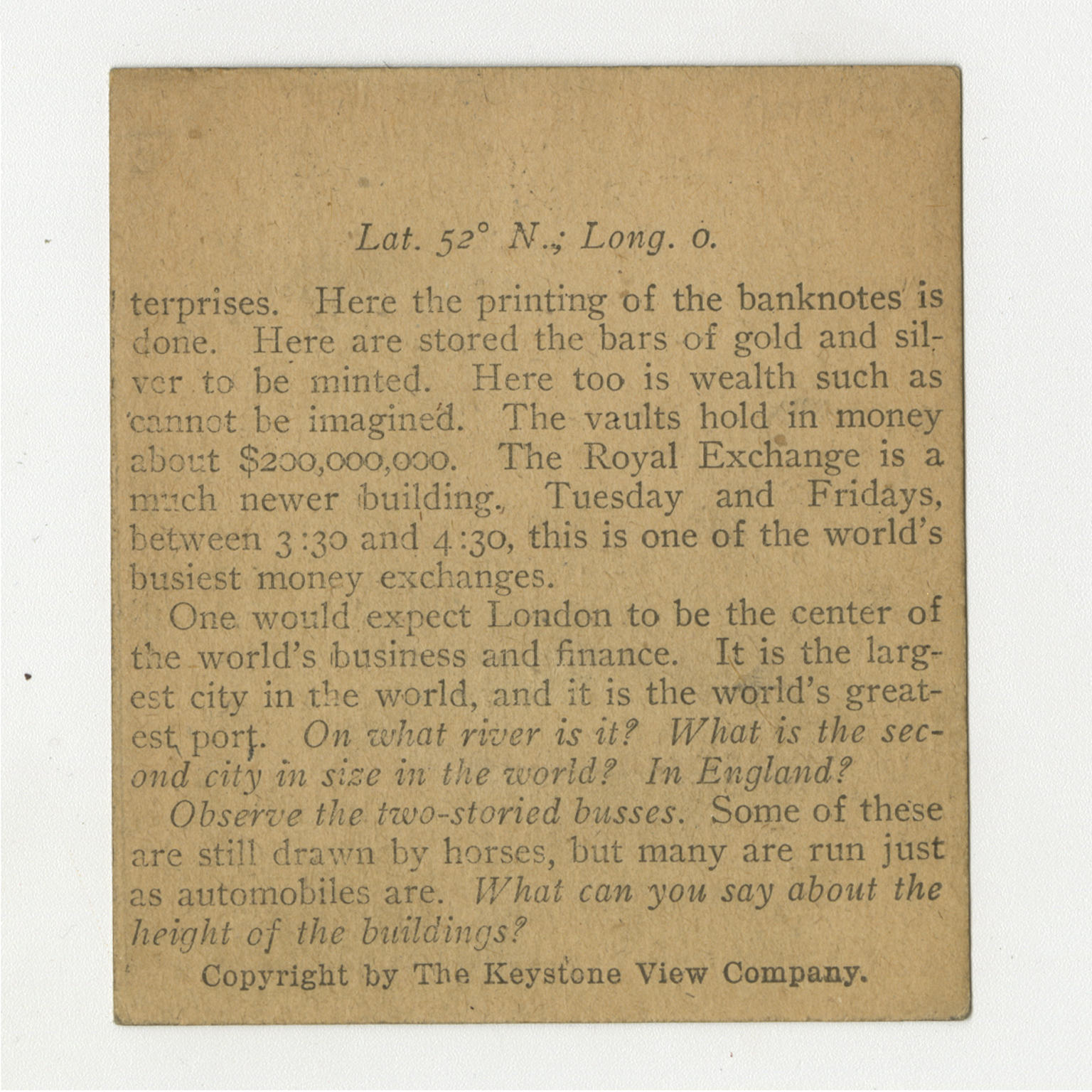 terprises. Here the printing of the banknotes is done. Here are stored the bars of gold and silver to be mined. Here too is wealth such as cannot be imagined. The vaults hold in money about $200,000,000. The Royal Exchange is a much newer building. Tuesday and Fridays between 3:30 and 4:30, this is one of the world's busiest money exchanges. One would expect London to be the center of the world's business and finance. It is the largest city in the world, and it is the world's greatest port. On what river is it? What is the second city in size in the world? In England? Observe the two-stories busses. Some of these are still drawn by horses, but many are run just as automobiles are. What can you say about the height of the buildings?