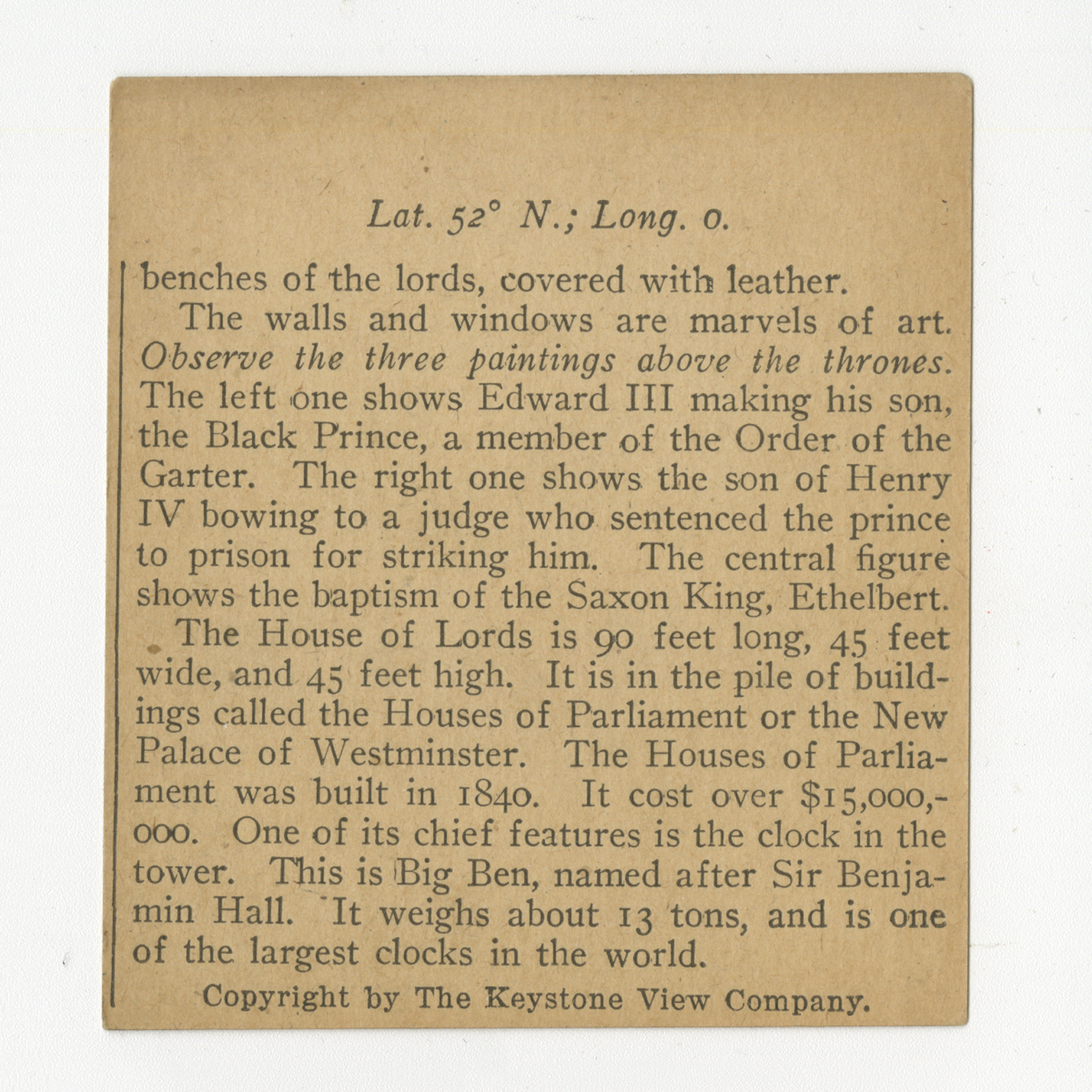 benches of the lords, covered with leather. The walls and windows are marvels of art. Observe the three paintings above the thrones. The left one shows Edward III making his son, the Black Prince, a member of the Order of the Garter. The right one shows the son of Henry IV bowing to a judge who sentenced the prince to prison for striking him. The central figure shows the baptism of the Saxon King, Ethelbert. The House of Lords is 90 feet long, 45 feet wide, and 45 feet high. It is in the pile of buildings called the Houses of Parliament or the New Palace of Westminster. The Houses of Parliament was built in 1840. It cost over $15,000,000. One of its chief features is the clock in the tower. This is Big Ben, named after Sir Benjamin Hall. It weighs about 13 tons, and is one of the largest clocks in the world.