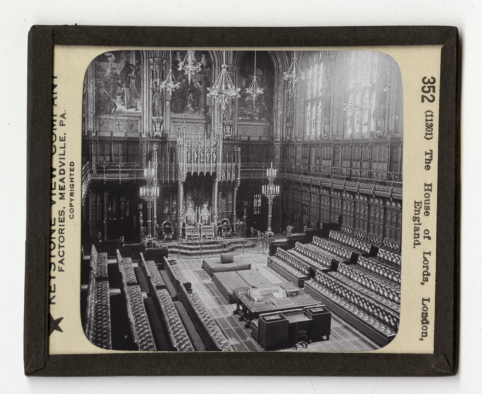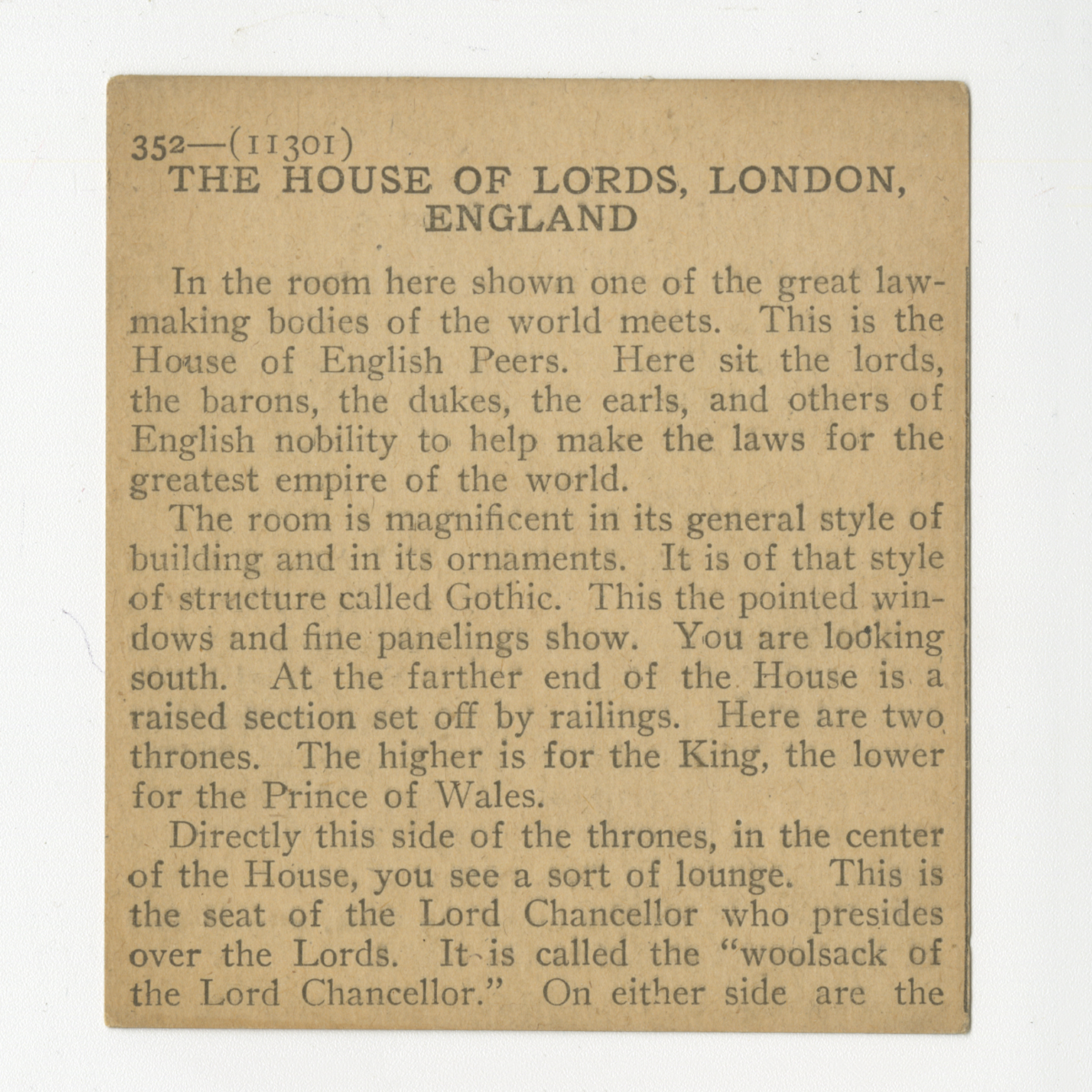 In the room here shown one of the great lawmaking bodies of the world meets. This is the House of English Peers. Here sit the lords, the barons, the dukes, the earls, the others of English nobility to help make the laws for the greatesr empire of the world. The room is magnificent in its general style of building and in its ornaments. It is of that style of structure called Gothic. This the pointed windows are fine panelings show. You are looking south. At the farther end of the House is a raised section set off by railinga. Here are two thrones. The higher is for the King, the lower for the Prince of Wales. Directly this side of the thrones, in the center of the House, you see a sort of lounge. This is the seat of the Lord Chancellor who presides over the Lords. It is called the "woolsack of the Lord Chancellor." On either side are the