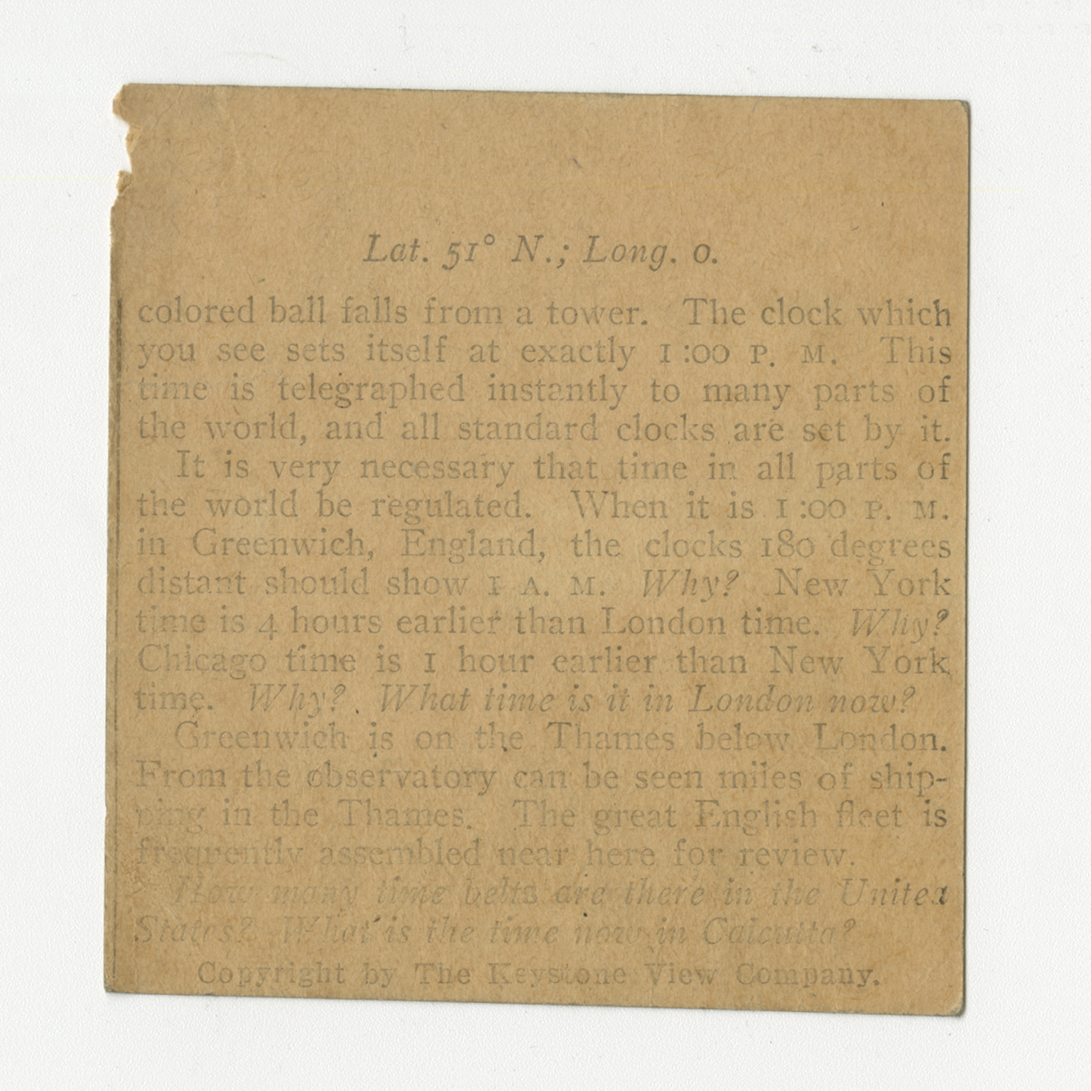 colored ball falls from a tower. The clock which you see sets itself at exactly 1:00 P.M. This time is telegraphed instantly to many parts of the world, and all standard clocks are set by it. It is very necessary that time in all parts of the world be regulated. When it is 1:00 P.M. in Greenwich, England, when they clocks 180 degrees distant should show 1 A.M. Why? New York times is 4 hours earlier than London time. Why? New York time is 4 hours earlier than London time. Why? Chicago time is 1 hour earlier than New York time. Why? What time is it in London now? Greenwich is on the Thames below London. From the observatoru can be seen miles of shipping in the Thames. The great English fleet is frequently assembled near here for review. How many time belts are there in the Unitea States? What is the time now in Calcutta?