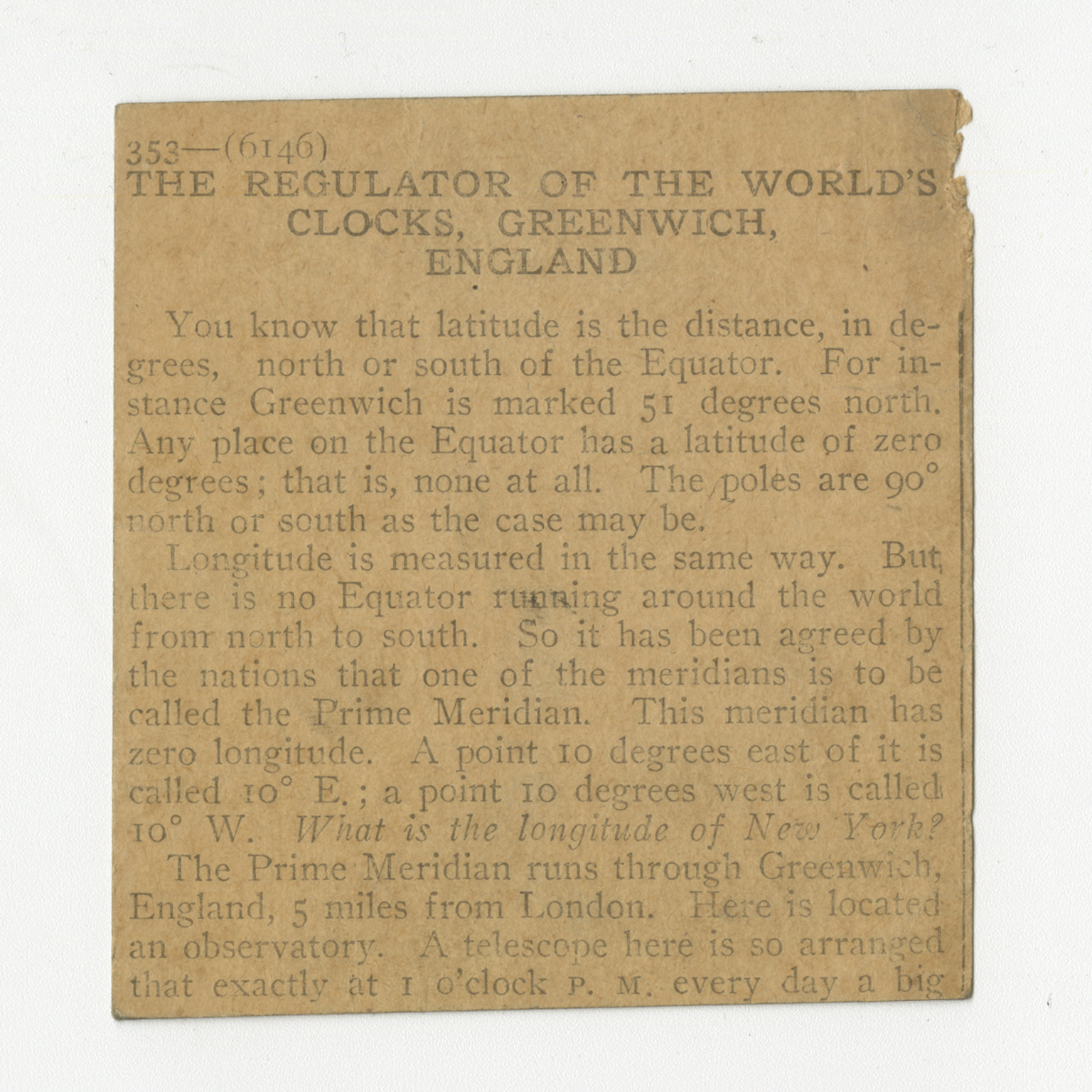 You know that latitude is the distance, in degrees, north or south of the Equator. For instance Greenwich is marked 51 degrees north. Any place on the Equator has a latitude of zero degrees; that is, none at all. The poles are 90 north or south as they case may be. Longtitude is measured in the same way. But there is no Equator running around the world from north to south. So it has been agreed by the nations that one of the meridians is to be called the Prime Meridian. This meridian has zero longtitude. A point 10 degrees east of it is called 10 E.; a point 10 degrees west is called 10 W. What is the longtitude of New York? The Prime Meridian runs through Greenwich, England, 5 miles from London. Here is located an observatory. A telescope here is so arranged that exactly at 1 o'clock P.M. every day a big