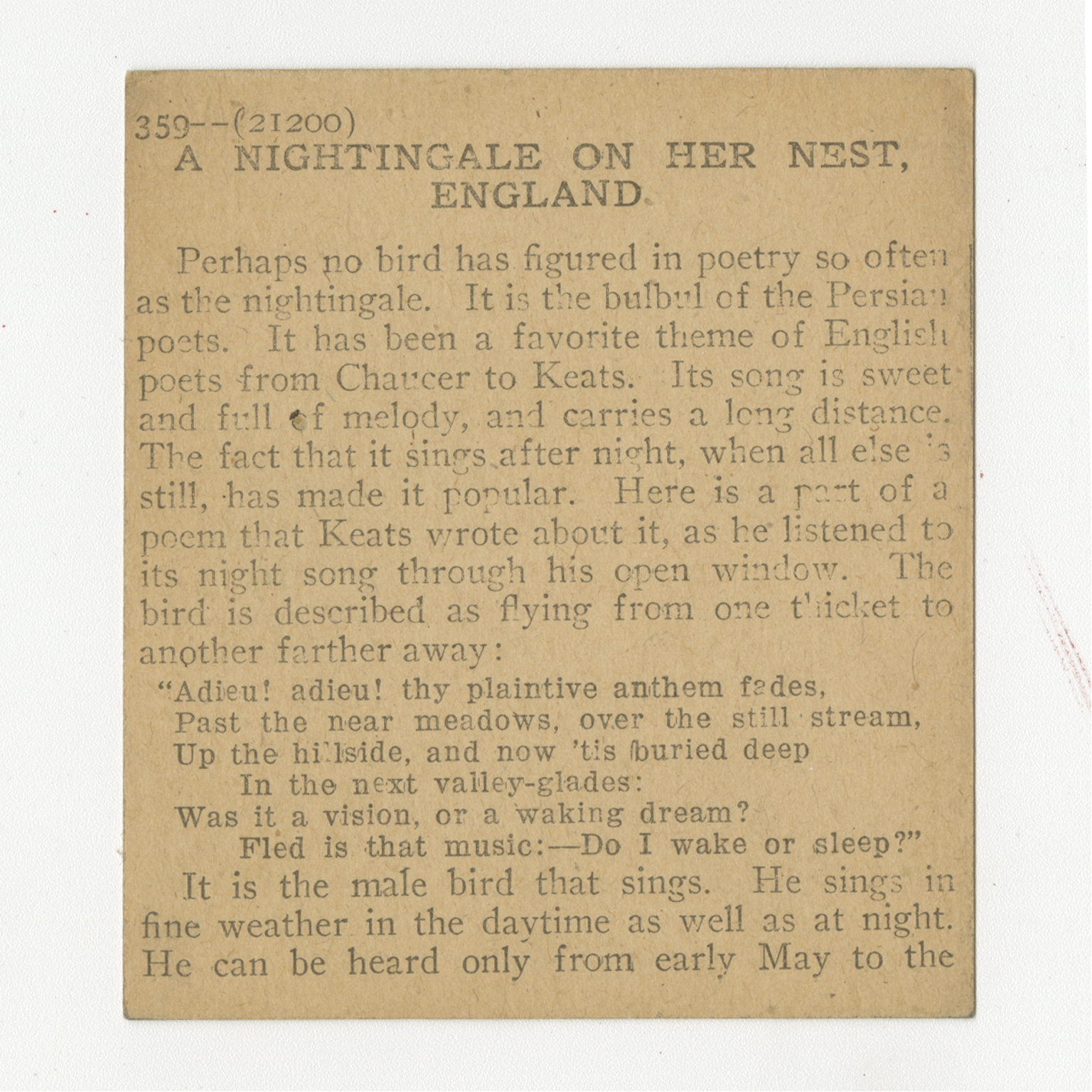 Perhaps no bird has figured in poetry so often as the nightingale. It is the bulbul of the Persian poets. It has been a favorite theme of English poets from Chaucer to Keats. Its song is sweet and full of melody, and carries a long distance. The fact that it sings after night, when all else is still, has made it popular. Here is a part of a poem that Keats wrote about it, as he listened to its night song through his open window. The bird is described as flying from one thicket to another farther away: "Adieu! adieu! thy plaintive anthem fades, Past the near meadows, over the still stream, Up the hillside, and now 'tis buried deep In the next valley-glades: Was it a vision, or a waking dream? Fled is that music:--Do I wake or sleep?" It is the male bird that sings. He sings in fine weather in the daytime as well as at night. He can be heared only from early May to the
